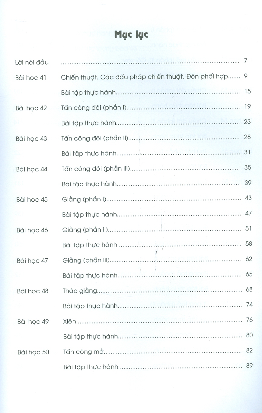 Mục lục Bài học 41: Chiến thuật. Các đấu pháp chiến thuật. Đòn phối hợp Bài thự hành Bài học 42: Tấn công đôi (phần 1) Bài tập thực hành Bài học 43: Tấn