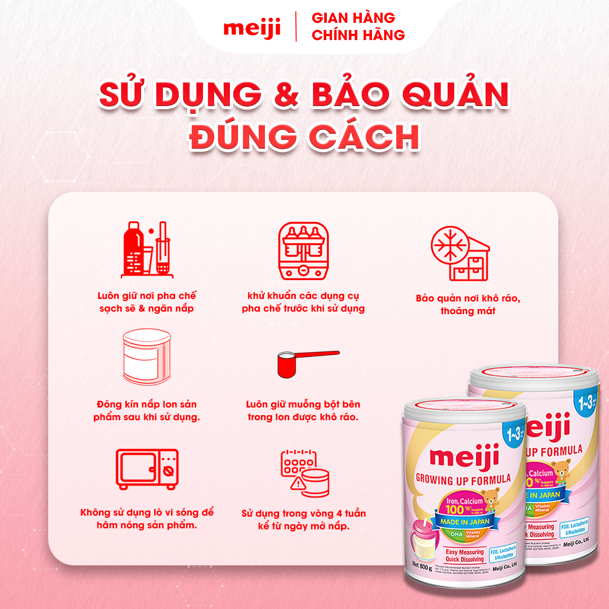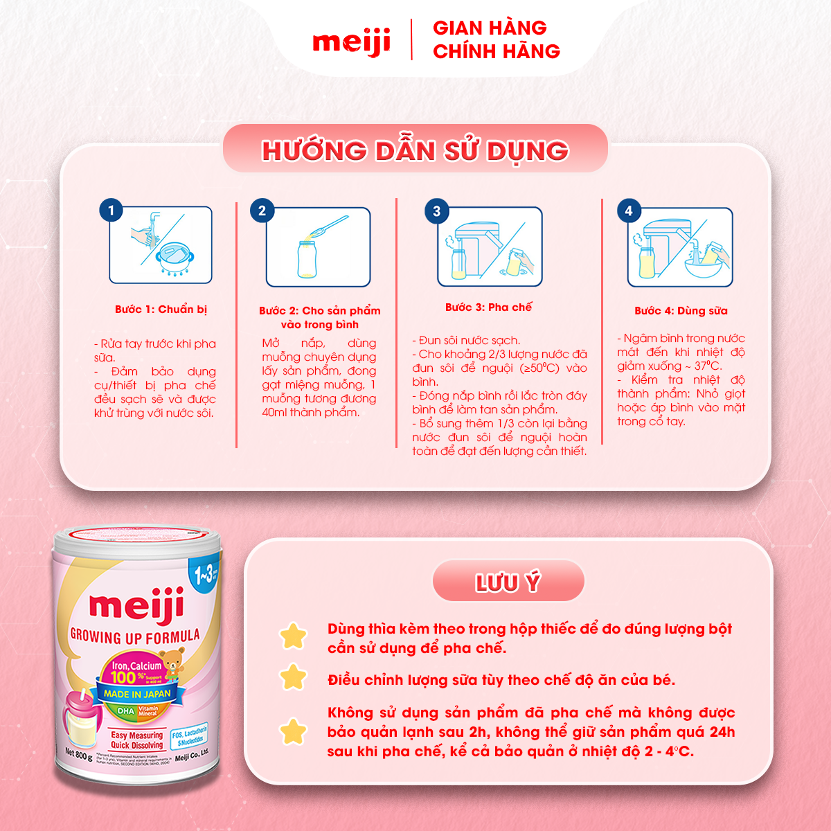 - Bổ sung sắt phòng ngừa thiếu máu do sắt hay gặp ở trẻ em và Canxi giúp phát triển chiều cao tối ưu, đồng thời bổ sung Lactadherin tăng cường khả năng miễn dịch. HƯỚNG DẪN SỬ DỤNG MEIJI MAMA MILK: