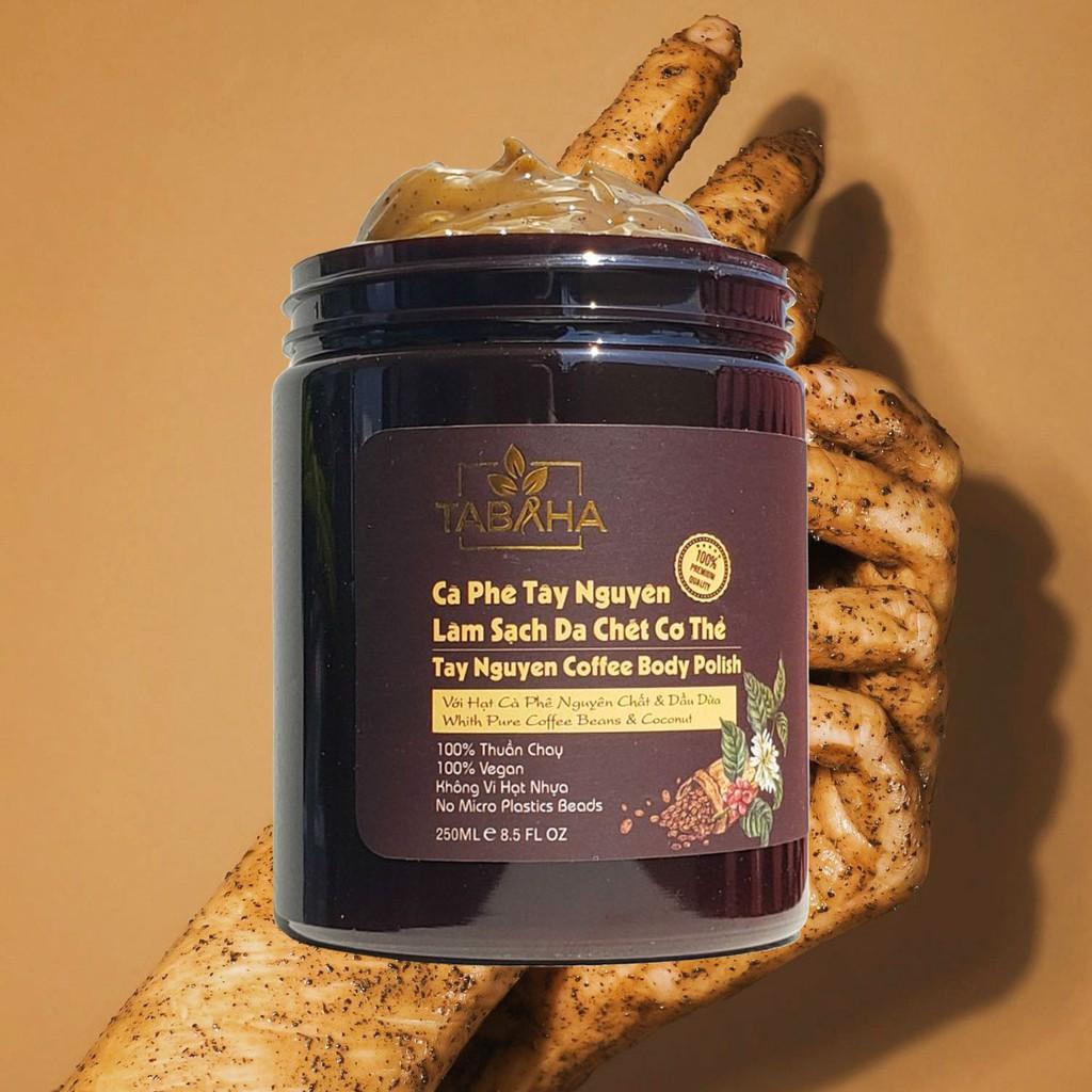Cà phê Tây Nguyên Làm Sạch Da Chết Cơ Thể 250ml Thành phần chính: Cà phê Tây Nguyên: Cà phê có tác dụng cao trong việc chống oxi hóa, đặc biệt cafein trong hạt cà phê sẽ giúp da trở nên săn chắc, đều màu, mang lại nhiều nguồn năng lượng cho làn da luôn mềm mại và rạng rỡ. Tinh chất bơ: Có khả năng giữ ẩm cao, giảm những vết rạn, làm mềm da và cải thiện những vùng da bị chai sần Tinh dầu dừa: Làm sạch các da chết, tái tạo da khô và làm mờ các vết nứt nẻ và ngăn ngừa thâm sạm da Công dụng: Giúp làm sạch da chết cơ thể hiệu quả, làm đều màu da, mang lại năng lượng giúp da mềm mại và rạng rỡ Cách dùng: Làm ướt da, thoa một lượng sản phẩm vừa đủ lên da. Mát-xa nhẹ nhàng từ cổ đến chân 10 đến 20 phút, sau đó tắm sạch với nước. Dùng 2 đến 3 lần trên tuần để đạt hiệu quả cao nhất Khác biệt của cà phê làm sạch da chết Tabaha