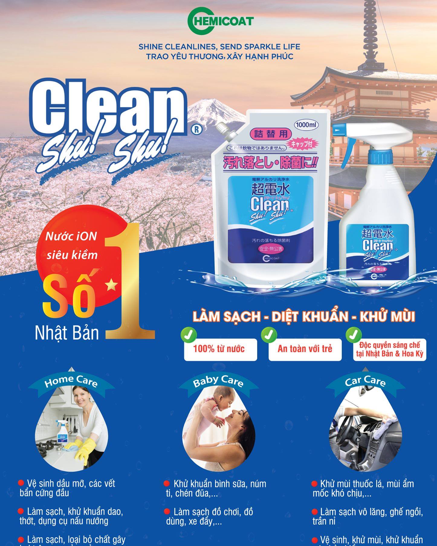 Clean Shu! Shu! Làm sạch - Diệt khuẩn - Khử mùi 100% nước ion kiềm. Là sản phẩm bán chạy nhất tại thị trường Nhật Bản với thiết kế linh hoạt & thân thiện. Thiết kế tiện dụng với 2 kiểu đầu xịt "Xịt tập trung" và "Xịt phân tán" Bạn có thể thay đổi tùy theo mục đích sử dụng và vệ trí cần vệ sinh. THÔNG TIN SẢN PHẨM Thành phần 100% nước ion kiềm, KHÔNG BỌT - KHÔNG MÙI - KHÔNG MÀU - KHÔNG HÓA CHẤT Nước ion kiềm Clean Shu Shu được điện phân hoàn toàn từ nước tinh khiết đã qua xử lý RO. Sản xuất trên dây truyền công nghệ của Nhật Bản, được cấp quyền sáng chế tại Mỹ và Nhật Bản. Đây là dòng sản phẩm LÀM SẠCH-DIỆT KHUẨN- KHỬ MÙI đứng số 1 tại Nhật Bản từ năm 1997. Công dụng sản phẩm