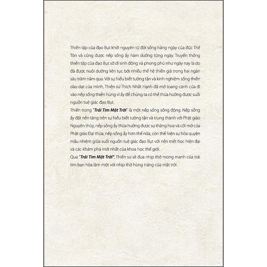 Thiền trong Trái Tim Mặt Trời là một nếp sống sống động. Nếp sống ấy đặt nền tảng trên sự hiểu biết tường tận và trung thành với Phật giáo Nguyên thủy, nếp sống ấy thừa hưởng được sự thăng hoa và cởi mở của Phật giáo Đại thừa, nếp sống ấy hơn thế nữa, còn thể hiện sự hòa quyện mầu nhiệm giữa suối nguồn tuệ giác đạo Bụt với nền triết học hiện đại và các khám phá mới nhất của khoa học thế giới.