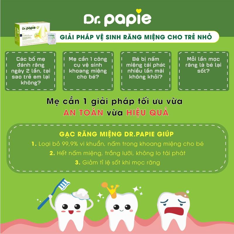Giới Thiệu - Gạc răng miệng Dr Papie là sản phẩm dùng để hỗ trợ việc vệ sinh răng miệng dễ dàng hơn. Gạc được tẩm những thành phần có tác dụng làm sạch, vệ