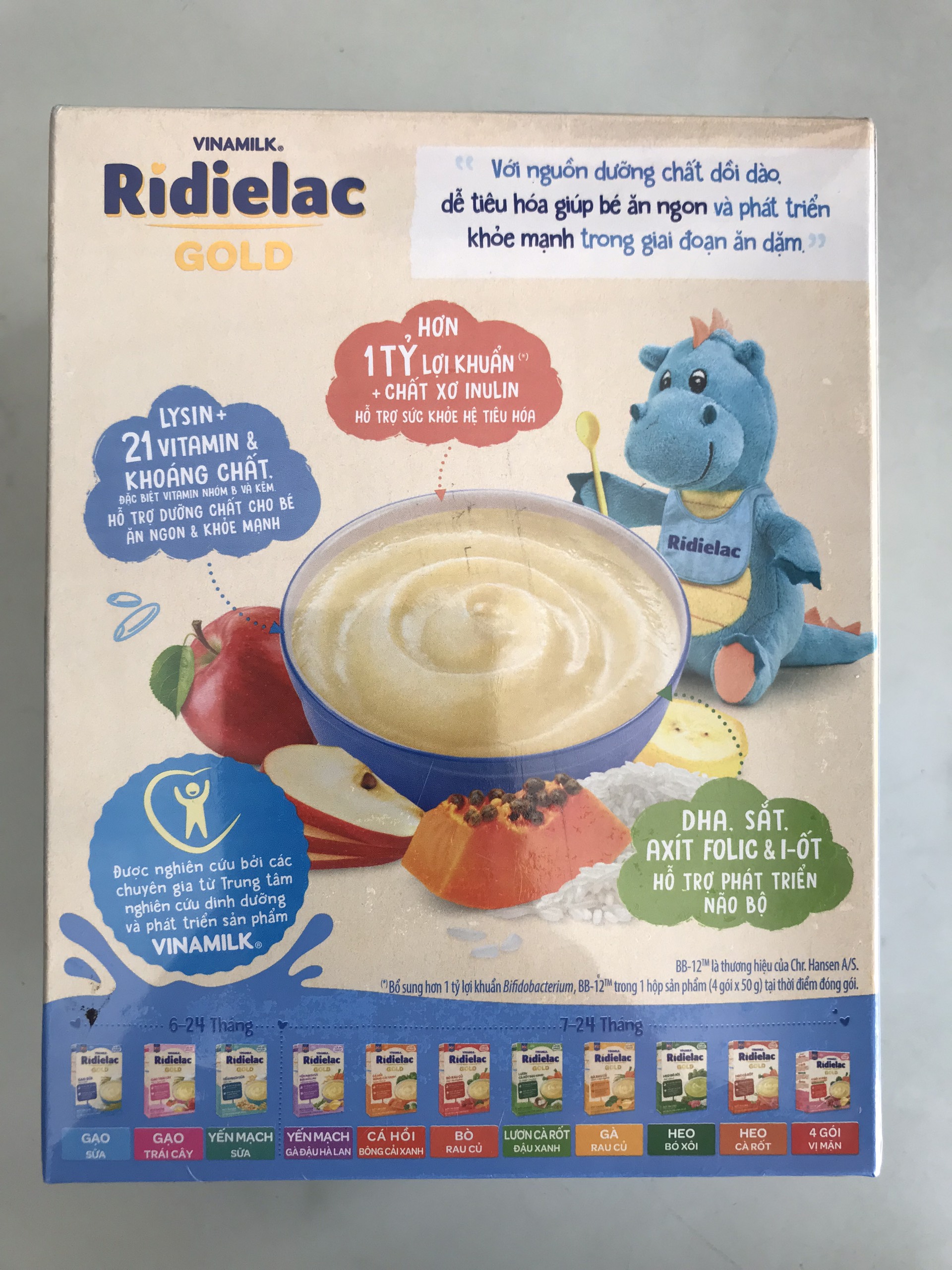 - Sản phẩm này là thức ăn bổ sung và được ăn thêm cùng với sữa mẹ dùng cho trẻ trên 06 tháng tuổi Bột ăn dặm RiDielac Gold dễ tiêu hóa được nghiên cứu bởi các chuyên gia từ Trung tâm nghiên cứu dinh dưỡng và phát triển sản phẩm VINAMILK, đáp ứng nhu cầu dinh dưỡng cho trẻ từ 6 đến 24 tháng tuổi, giúp bổ sung các dưỡng chất, hỗ trợ bé phát triển thể chất trong thời gian ăn dặm. HỖ TRỢ SỨC KHỎE HỆ TIÊU HÓA Bổ sung lợi khuẩn Bifidobacterium, BB-12TM cùng chất xơ hòa tan inulin giúp tăng vi khuẩn có lợi, ức chế vi khuẩn có hại, hỗ trợ tốt sức khỏe hệ tiêu hóa, giúp bé hấp thu nguồn dưỡng chất dồi dào, cho bé phát triển thể chất khỏe mạnh. BB-12 là thương hiệu của Chr. Hansen A/S. HỖ TRỢ DƯỠNG CHẤT CHO BÉ ĂN NGON VÀ KHỎE MẠNH Lysin, vitamin nhóm B và Kẽm giúp bé ăn ngon miệng. Ngoài ra, sản phẩm có chứa 21 vitamin và khoáng chất bao gồm Sắt, Canxi, vitamin D3, C, A, E, giúp bé phát triển cứng cáp hơn. HỖ TRỢ PHÁT TRIỂN NÃO BỘ Axít folic, I ốt, Sắt, Taurin, Axít linoleic, đặc biệt DHA kết hợp với Lutein tạo thành hệ dưỡng chất thiết yếu cho sự phát triển của não bộ, võng mạc mắt, tăng khả năng nhận thức, ghi nhớ và học hỏi của bé. MẪU BAO BÌ THAY ĐỔI THEO TỪNG ĐỢT NHẬP HÀNG.