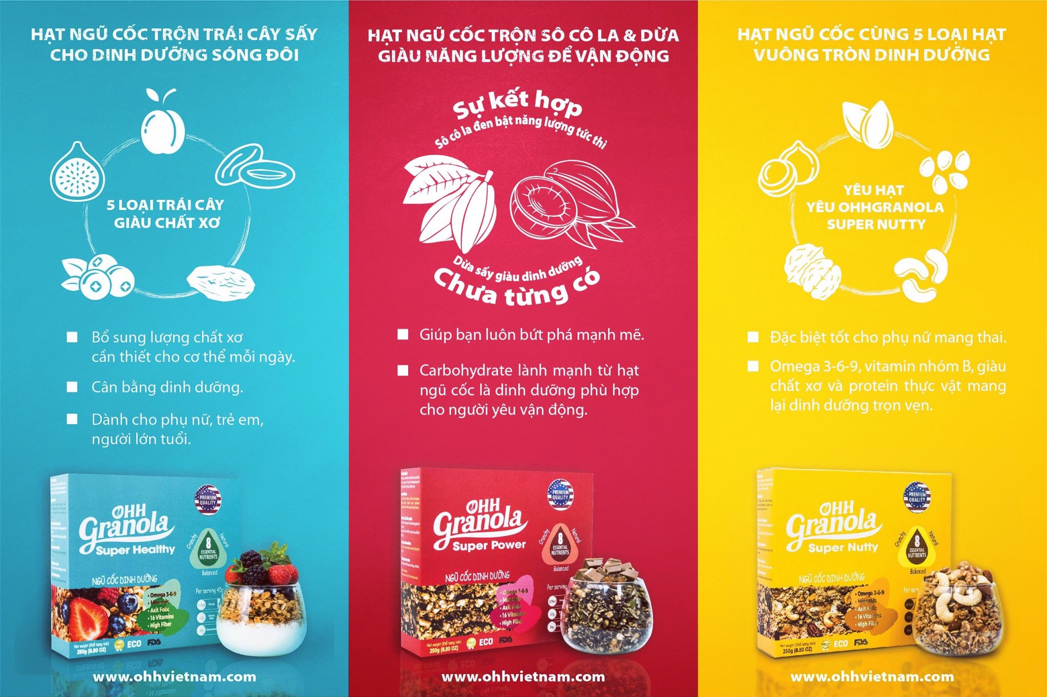 Thành phần dinh dưỡng vượt trội Super Power – Ohh Granola: yến mạch, mắc ca, hạnh nhân, hạt điều, hạt óc chó, hạt mè, hạt bí ngô, hạt hướng dương kết hợp sự khác lạ của Ohh Granola là dừa sấy, ngũ cốc được mix với bột cacao nguyên chất; kết hợp với 5% mật ong, dầu thực vật, đường nâu, 1% muối.