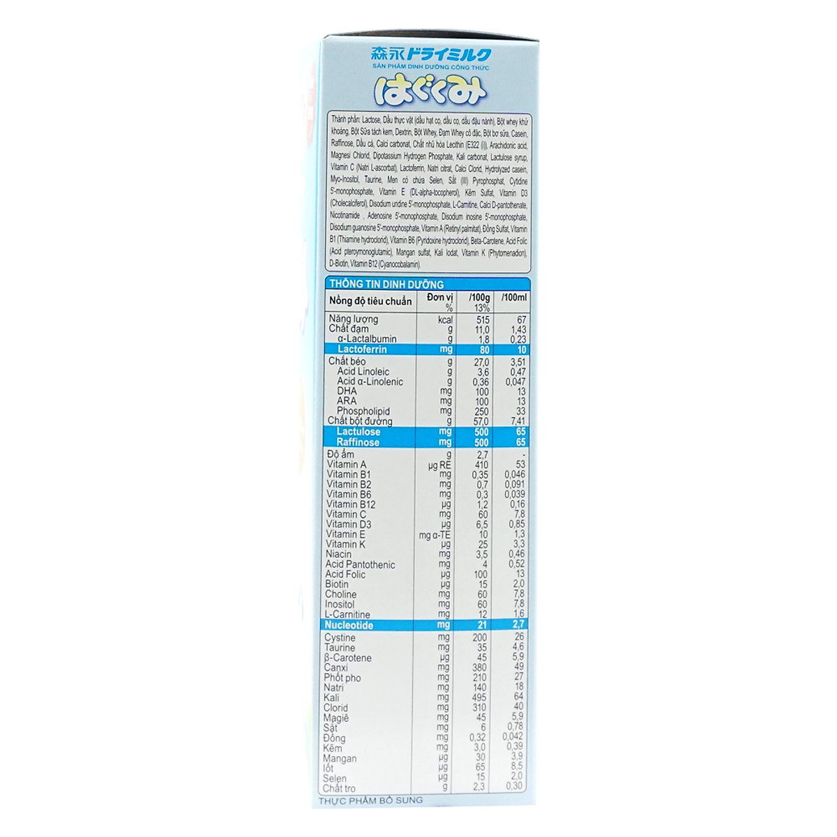 Lactose, Dầu thực vật (dầu hạt cọ, dầu cọ, dầu đậu nành), Đạm Whey khử khoáng, Sữa tách kem, Dextrin, Đạm sữa Whey, Whey tự nhiên, Bơ, Casein, Rafinose, Dầu cá, Canxi carbonat, Lecithin đậu nành, Dầu Arachidonic acid, Magiê Clorua, Dipotassium Hydrogen Phosphate, Kali cacbonat, Lactulose syrup, Vitamin C, Lactoferrin, Natri citrat, Kali Clorua, Hydrolyzed casein, Inositol, Taurine, Men, Sắt Pyrophosphate, Disodium 5'-cytidylate, Vitamin E, Kẽm Sunfat, Vitamin D3, Disodium 5'-uridylate, L-Carnitine, Canxi pantothenate, Nicotinamide, 5'-Adenylic acid, Disodium 5'-inosinate, Disodium 5'-guanylate, Vitamin A, Đồng Sunfat, Viatmin B1, Vitamin B6, β-Carotene, Axit folic, Mangan sunfat, Kali Iodua, Vitamin K, Biotin, Vitamin B12.