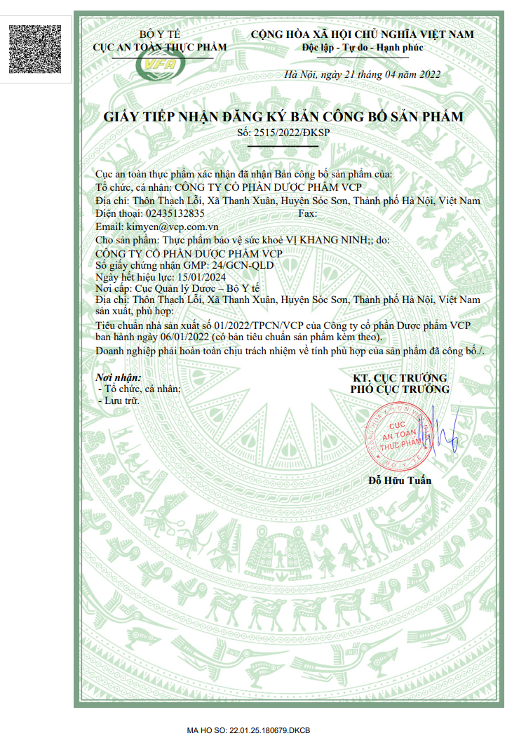 - Tiêu chuẩn: TCCS Hạn dùng: 36 tháng kể từ ngày sản xuất Số ĐKSP: 2515/2022/ĐKSP Số GPQC: 1416/2022/XNQC-ATTP
