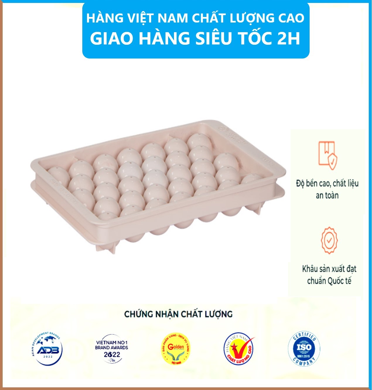 Khay đá nhà Việt Nhật được sản xuất theo tiêu chuẩn của các thị trường khó tính như: Hoa Kì , EU , Nhật Bả chất liệu được làm từ 100% nhựa nguyên sinh PP , có kiểm định hoàn toàn an toàn cho người dùng