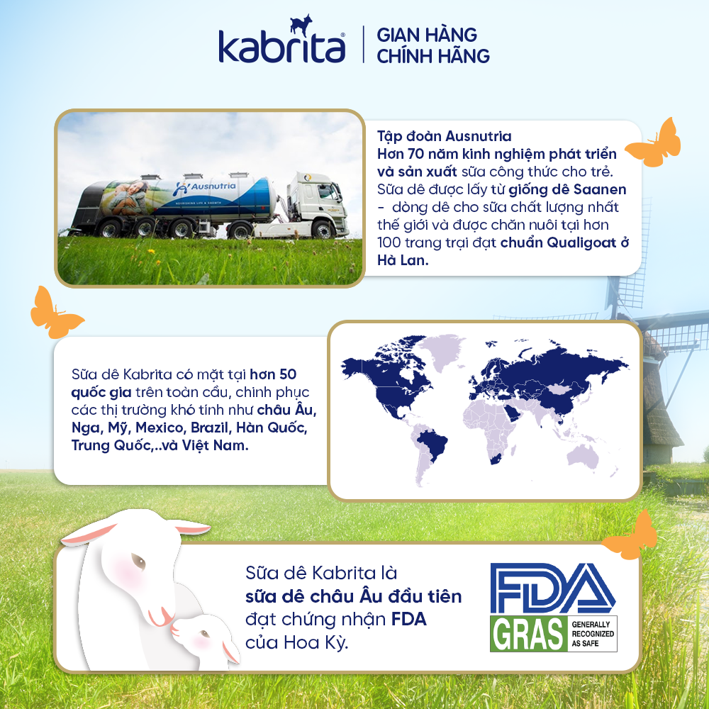 Sữa dê Kabrita là một thương hiệu thuộc tập đoàn Ausnutria - chuyên sản xuất & tiếp thị các sản phẩm sữa công thức với lịch sử hơn 100 năm. Sữa dê Kabrita hiện có mặt chính thức ở 44 quốc gia trên thế giới, bao gồm Việt Nam, được nhập khẩu chính hãng với giấy tờ đầy đủ & được Bộ Công thương cấp phép.