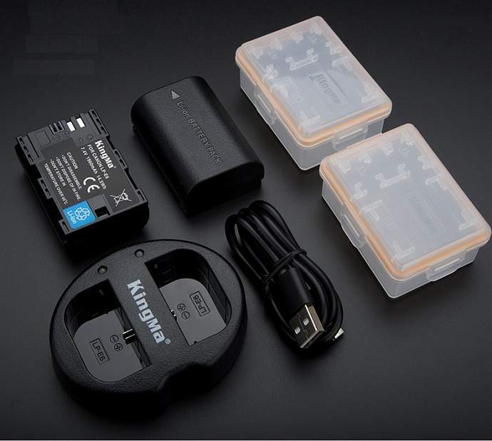 THÔNG SỐ KỸ THUẬT PIN: Hãng sản xuất: Kingma Mã sản phẩm: LP-E6 Dòng pin: Li-ion Volts: 7.4V Dung lượng: 1960mAh 14.5Wh Kích thước: 45 x 31.8 x 18.5mm Tương thích: Máy ảnh Canon EOS 5D Mark IV / 5D Mark III / 5DS / 5DS R / 5D Mark II / 6D Mark II / 7D Mark II / 7D / 80D / 70D / 60D / 60Da THÔNG SỐ KỸ THUẬT SẠC: Hãng sản xuất: Kingma Mã sản phẩm: BM015-LPE6 Kích thước: 80 x 64 x 24.5mm Input: 5V 2A Output: 8.4V 600mA (X2) Trọng lượng: 83g Combo bao gồm: 1 sạc, 1 dây cáp và 2 pin LP-E6