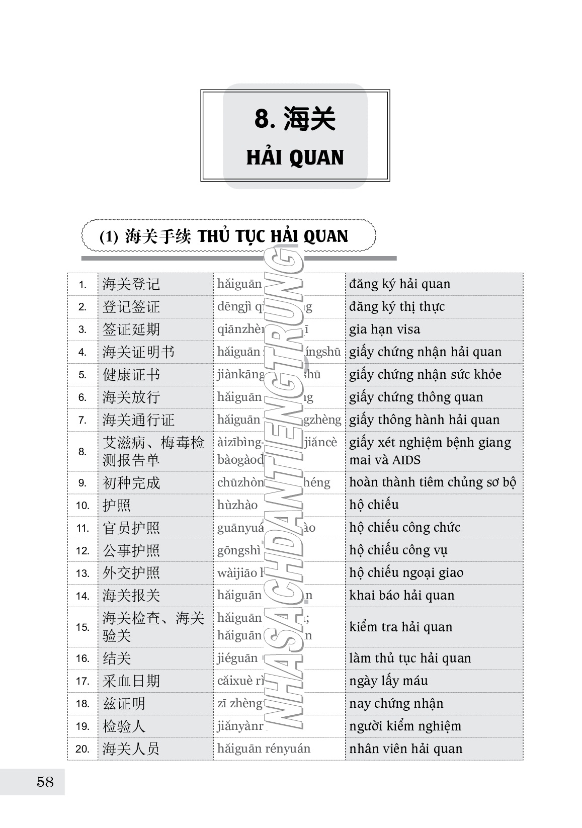 - Ngoại thương, Hiện nay, tiếng Hán được dùng rộng rãi, phổ biến trong nhiều lĩnh vực xã hội, người học tập và sử dụng tiếng Hán càng có nhu cầu muốn biết những từ mới và thuật ngữ tiếng Hán thuộc từng lĩnh vực chuyên môn. Quyển TỪ ĐIỂN CHỦ ĐIỂM HÁN – VIỆT HIỆN ĐẠI được xuất bản nhằm đáp ứng nhu cầu đó. Khác với các quyển từ điển Hán – Việt hiện đại thông thường, nội dung quyển TỪ ĐIỂN CHỦ ĐIỂM HÁN – VIỆT HIỆN ĐẠI không được sắp xếp theo thứ tự phiên âm La-tinh mà được sắp xếp theo từng chủ điểm. Có tất cả 58 chủ điểm, bao gồm những thông tin từ vựng về các lĩnh vực khác nhau của đời sống xã hội: từ các thông tin có liên quan đến đời sống thường ngày về nơi ở, nơi làm việc, nơi công cộng, nơi vui chơi giải trí… đến các lĩnh vực chuyên môn như kinh tế, tài chính, du lịch, kỹ thuật, thể thao, văn hóa, tôn giáo…, cho đến các tổ chức thuộc cơ cấu xã hội như bệnh viện, tòa án, nhà tù, quân đội… Lượng từ vựng hết sức phong phú, có nhiều thuật ngữ chuyên môn, lại được cân nhắc, chọn lọc cho phù hợp với đời sống văn hóa xã hội của nước ta. Từ điển được trình bày theo dạng bảng từ, gồm ba cột: từ ngữ Hán, phiên âm, nghĩa tiếng Việt tương đương; có sự phân cách rõ ràng giữa các chủ điểm lớn với nhau, mỗi chủ điểm lớn lại được chia thành những chủ điểm nhỏ theo từng nội dung để người đọc dễ tra cứu. Chúng tôi đã đưa thêm một số chủ đề mới mà người sử dụng tiếng Hán ở Việt Nam thường gặp như may mặc, da dày, cơ khí, điện, điện tử, tin học và kinh tế… Đây là những chủ đề mà chúng tôi đã được bạn đọc “đặt hàng” trong quá trình biên soạn. Rất nhiều bạn đọc đã liên hệ với chúng tôi, mong muốn có tài liệu tham khảo cho lĩnh vực mà họ quan tâm. Nhận thấy đây là những chủ đề rất cần thiết trong khi hầu như không có tài liệu tham khảo, chúng tôi đã mạnh dạn biên soạn để bổ sung vào từ điển, rất mong có thể đáp ứng được phần nào nhu cầu của độc giả.