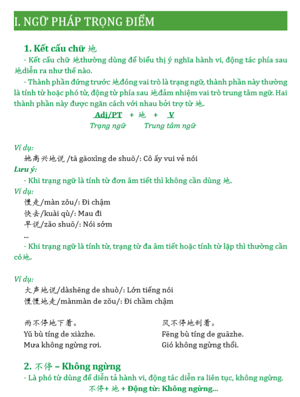 Phần 2: Ở mỗi điểm ngữ pháp, có từ 2-4 ví dụ minh họa cách sử dụng, các ví dụ được thiết kế tùy theo mục đích người học, ví dụ mang tính học thuật dành cho người học thi HSK và ví dụ giao tiếp đời sống. Ngoài ra có sự đan xen giữa hội thoại và đoạn văn giúp người học thực hành giao tiếp, thực hành luyện viết theo đoạn văn ngắn. Toàn bộ ví dụ, hội thoại và đoạn văn đều có đầy đủ phiên âm, chữ Hán, và tiếng Việt để tiện tra cứu và tự học.
