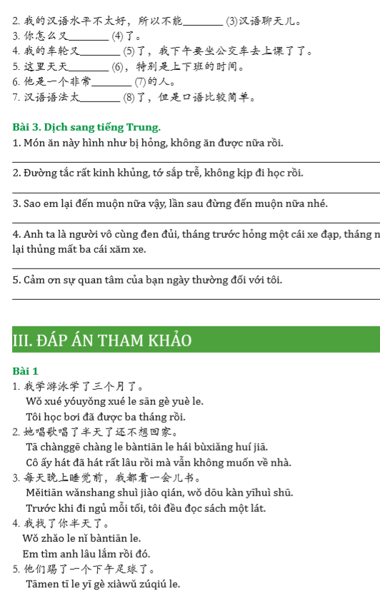 Phần 4: Sau khi phân tích tỉ mỉ từng điểm ngữ pháp, cuốn sách đã thiết kế phần bài tập đa dạng bao gồm: dịch trung việt, việt trung, chữa lỗi sai, điền từ vào chỗ trống, sắp xếp câu, đảm bảo cho người học hiểu rõ và ứng dụng được 100% điểm ngữ pháp. Nội dung ví dụ xoay quanh chủ điểm của bài như mua bán, mặc cả để người học học có hệ thống. Điểm đặc biệt của cuốn sách phù hợp với người tự học đó chính là: