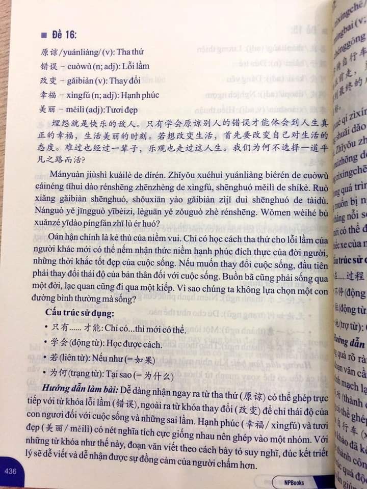 - Giới thiệu sách: Bài Tập Củng Cố Ngữ Pháp HSK – Cấu Trúc Giao Tiếp & Luyện Viết HSK 4-5 Kèm Đáp Án Tác giả: Nhật Phạm Số trang: 490 Ngày xuất bản: 01/11/2019 Nhà Xuất Bản: Dân Trí Giá bìa: 300,000 VNĐ MUỐN GIỎI NGỮ PHÁP CẤU TRÚC TIẾNG TRUNGMUỐN VIẾT HSK4-5 LÊN TRÌNH️Đừng bỏ qua cuốn này! ️ Bài tập ngữ pháp HSK1-6 ( Full ngữ pháp tiếng Trung) Luyện viết HSK4-5 với các đề thật HSK, sách có đáp án chi tiết, hướng dẫn làm bài! ️Lưu ý: Sách phù hợp cho các đối tượng từ cơ bản đến nâng cao! Đây là cuốn sách với tuyển tập các bài tập luyện dịch từ cơ bản đến nâng cao, phù hợp với các đối tượng bắt đầu học tiếng Trung với phần 1 "BÀI TẬP DỊCH TRUNG VIỆT-VIỆT TRUNG CỦNG CỐ CẤU TRÚC CỐ ĐỊNH & NGỮ PHÁP (Dựa theo ngữ pháp tiếng Hán Sơ trung cấp hiện đại", còn các đối tượng đã học đến HSK5-6 vẫn hoàn toàn có thể sử dụng để nâng cao kỹ năng biên dịch cũng như phục vụ cho phiên dịch với phần 2 "BÀI TẬP DỊCH NÂNG CAO KỸ NĂNG DỊCH VÀ TĂNG CƯỜNG CẤU TRÚC DỊCH NÂNG CAO (Có cung cấp cấu trúc và sử dụng). Cuốn sách được biên soạn chi tiết tỉ mỉ với các phần bài tập kèm phần đáp án có hỗ trợ từ vựng, cấu trúc hiếm gặp, cấu trúc nâng cao. Phần 1 là các câu tiếng Việt hoặc tiếng Trung thường sử dụng được biên soạn dựa theo hệ thống ngữ pháp tiếng Hán hiện đại ở cả mảng giao tiếp và hàn lâm học thuật giúp các bạn cải thiện, hoàn thiện kiến thức cũng như thực hành ứng dụng các mảng ngữ pháp, cấu trúc, đồng thời củng cố thêm vốn từ vựng tiếng Trung ứng dụng. Phần 2 là các đoạn văn ngắn với dung lượng 100-300 từ trong các lĩnh vực của đời sống như giao tiếp thương mại, kinh tế, giáo dục, du lịch, địa lý, đất nước con người Việt Nam, Phần này giúp các bạn rèn luyện thêm kỹ năng dịch, tích lũy các cấu trúc tiếng Trung nâng cao cũng như lượng từ vựng vô cùng phong phú ở nhiều lĩnh vực.Để có được cuốn sách giá trị này, NP BOOKS xin chân thành cảm ơn các biên tập viên Linh Chi, Thùy Linh, Hải Yến đã hỗ trợ chủ biên Nhật Phạm, đặc biệt cảm ơn cô giáo Khâu Phượng Nghi (Giáo viên Trung Quốc) đã dành nhiều thời gian để kiểm duyệt nội dung, giúp cho cuốn sách có được tính bản ngữ tối đa đối với ngôn ngữ Trung Quốc.Chân thành cảm ơn độc giả đã, đang luôn yêu quý và ủng hộ những sản phẩm của NP BOOKS, hy vọng rằng độc giả sẽ có những ý kiến đóng góp để cuốn sách được hoàn thiện hơn nữa trong những lần tái bản sau.
