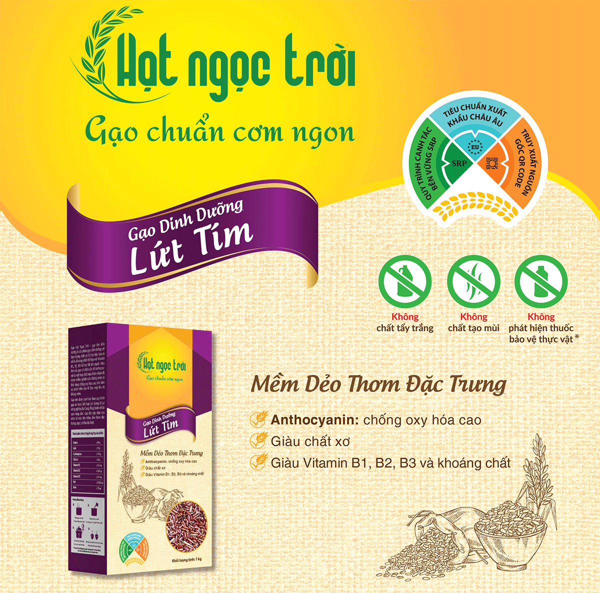 Mua tại TiktokAnthocyanin: chống oxy hóa cao Giàu Vitamin B1, B2, B3 và khoáng chất Hàm lượng chất xơ cao, tốt cho người ăn kiêng giảm cân Cung cấp nhiều dinh dưỡng cho cơ thể Hương vị thành phẩm thơm ngon Mùi thơm đặc trưng của giống lúa gạo tím, mềm dẻo và dễ ăn Hỗ trợ điều trị bệnh cao huyết áp, tiểu đường. Gạo dinh dưỡng Lứt Tím là sản phẩm gạo dinh dưỡng với hàm lượng chất xơ hỗ trợ tiêu hóa và nhiều khoáng chất kết hợp với Vitamin B1, B2, B3 tốt cho tim mạch. Màu tím của gạo có chứa sắc tố Anthocyanin là một hợp chất màu thiên nhiên đã được nhiều nghiên cứu chứng minh có khả năng chống oxy hóa cao, kìm hãm sự phát triển của tế bào ung thư và kháng viêm. Gạo Lứt Tím được canh tác theo quy trình gạo an toàn, kết hợp lực lượng kỹ sư nông nghiệp Ba Cùng đồng hành với bà con nông dân. Gạo khi nấu chín cho cơm có màu tím mềm, dẻo thơm đặc trưng, ngọt, vị khá đặc biệt. Thành phần dinh dưỡng (trong 1kg sản phẩm) Protein Lipid Carbohydrate Chất xơ Anthocyanin Vitamin B1 Vitamin B2 Vitamin B3 Kali Selen ≥ 80 g ≥ 20 g ≥ 700 g ≥ 30 g 30 mg - 40 mg ≥ 3.0 mg ≥ 300 µg ≥ 6.0 mg ≥ 2000 mg ≥ 25 µg LỢI ÍCH SỨC KHỎE KHI ĂN GẠO LỨT TÍM THAN