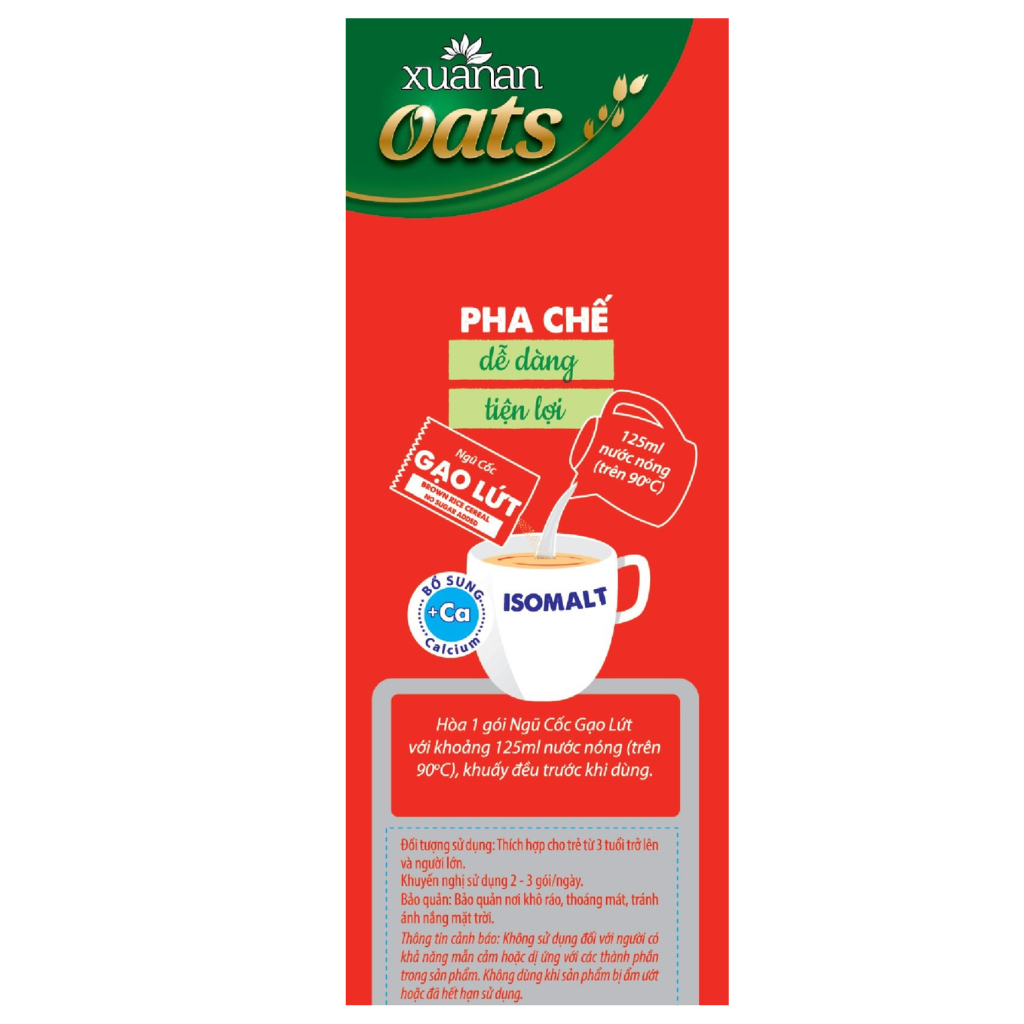 Ngũ Cốc Gạo Lứt No Sugar [đường ăn kiêng] 400G (25G16 GÓI) + Ngũ Cốc Yến Mạch ít đường 400G (25G16 GÓI) Ngũ cốc YẾN MẠCH được làm từ Yến mạch và nhiều loại Ngũ cốc bằng công thứ đặc biệt. Vitamin, chất xơ và đạm tự nhiên đem lại nguồn dinh dưỡng tốt cho sức khỏe. Sản phẩm được bổ sung thêm Can xi và sử dụng ít đường. Thành phần: Ngũ cốc 32% (Yến mạch 10%, gạo, gạo lứt 5%, bắp, đậu nành, lúa mì, lúa mạch), sữa bột nguyên kem, bột dừa, bột kem thực vật, đường, muối i-ốt, Canxi 0.7%, maltodextrin, chất là dày xanhthan gum (E415), chất chống đông vón (E551), hương liệu tổng hợp dùng cho thực phẩm. 7g đường trong 1 khẩu phần 25g. Ngũ cốc GẠO LỨT no Sugar là thức uống thơm ngon bổ dưỡng, được làm từ gạo lứt, yến mạch, hạt sen và rất nhiều loại ngũ cốc. Sản phẩm được bổ sung thêm can xi, sử dụng đường ăn kiêng, không sử dụng đường mía. Vitamin, khoáng chất, chất xơ tự nhiên giúp hấp thu dinh dưỡng tốt và thanh lọc cơ thể. Thành phần: Ngũ cốc 60% (bột gạo lứt 10%, yến mạch 6%, đậu đen xanh lòng 3%, nếp cẩm 3%, bắp, đậu nành, gạo, lúa mỳ, lúa mạch), hạt sen 3%, bột kem thực vật, bột dừa, sữa bột tách béo 7% (Instant skim milk powder 7%), Isomalt 3%, Canxi 0.7%, Muối I-ốt, Chất làm dày xanthan gum (E415), chất tạo ngọt (INS 951), chất chống đông vón (E551), Maltodextrin, hương liệu tổng hợp dùng cho thực phẩm. Đối tượng sử dụng: Trẻ từ 3 tuổi trở lên và người lớn, người ăn theo chế độ giảm đường. Hướng dẫn sử dụng: Hòa 1 gói Ngũ cốc  với khoảng 125ml nước sôi, khuấy đều trước khi dùng. Dùng 2-3 gói mỗi ngày Bảo quản: Bảo quản nơi khô ráo, thoáng mát; tránh tiếp xúc trực tiếp với không khí và ánh nắng mặt trời. Thông tin cảnh báo: Không dùng khi sản phẩm bị rách, mốc hoặc đã hết hạn sử dụng. Sản phẩm của: Công ty TNHH Thực Phẩm Dinh Dưỡng Xuân An