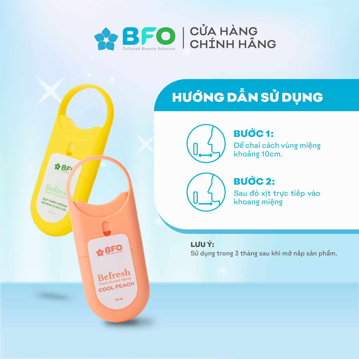 Combo 2 Xịt Thơm Miệng Befresh Cho Hơi Thở Thơm Mát Chỉ Trong 3 Giây Dung Tích 10ml ƯU ĐIỂM NỔI BẬT: Khử mùi hôi trong khoang miệng nhanh chóng chỉ trong 3 giây, giúp hơi thở thơm mát, sảng khoái. Chiết xuất từ tinh dầu trà xanh - bạc hà hoàn toàn thiên nhiên, cho hương thơm tự nhiên, không nồng, không khó chịu, an toàn khi nuốt. Thiết kế nhỏ gọn, tiện lợi, luôn sẵn sàng bên bạn trong bất kỳ cuộc hẹn nào. Sản phẩm không thể thay thế kem đánh răng và nước súc miệng, do đó bạn nên kết hợp đánh răng, súc miệng và xịt miệng để đảm bảo sức khỏe răng miệng và tự tin với khoang miệng sạch thơm suốt ngày dài. THÀNH PHẦN: Tinh dầu bạc hà có công dụng khử mùi hôi, hỗ trợ làm sạch răng miệng. Tinh dầu trà xanh giúp ngăn ngừa sâu răng, hạn chế các vấn đề về nướu và chân răng. Vị the mát sảng khoái giúp giảm căng thẳng, tăng cường năng lượng, kích thích sự tập trung tinh thần. MÙI HƯƠNG 4 LOẠI: VỊ ĐÀO ️ VỊ DÂU BẠC HÀ TRÀ XANH - BẠC HÀ DƯA LƯỚI HƯỚNG DẪN BẢO QUẢN: Đậy nắp kín sau khi sử dụng. Bảo quản nơi khô ráo, thoáng mát. Tránh nhiệt độ cao. Tránh ánh nắng trực tiếp. Xuất xứ: Việt Nam THÔNG TIN THƯƠNG HIỆU: Thương hiệu BFO: Tự hào là chuỗi cửa hàng cung cấp các sản phẩm chăm sóc và làm đẹp toàn diện, giá tốt, chất lượng độc tôn trên toàn Châu Á. Với niềm tin mãnh liệt trong từng sản phẩm tạo ra, BFO hy vọng mang lại những trải nghiệm tốt nhất cho người tiêu dùng: HIỆU QUẢ - TỐI GIẢN - THOẢI MÁI.