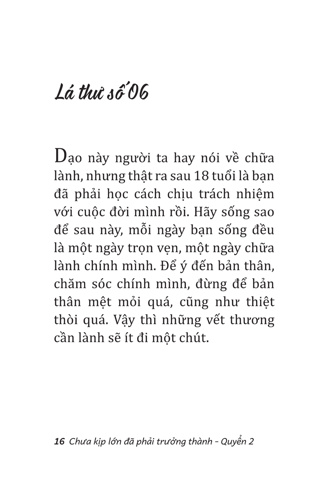 Nếu như bạn đang cảm thấy chơi vơi, vô định, hoang mang với con đường mà mình đang đi, mơ hồ với mỗi ngày mở mắt ra và nhìn đâu cũng thấy mịt mù không lối rẽ, hãy để cuốn sách “Chưa kịp lớn đã phải trưởng thành” quyển 1 và “Chưa kịp lớn đã phải trưởng thành” phiên bản mùa hè bầu bạn cùng bạn. Đây là 2 cuốn sách trong bộ sách “Chưa kịp lớn đã phải trưởng thành” của Timebooks - Bộ sách đồng hành cùng các bạn trẻ trên hành trình học cách lớn lên. Mỗi trang sách giống như một lá thư từ “một người bạn tâm giao”, cổ vũ bạn vững vàng bước qua những ngày hè rực rỡ nhất của tuổi trẻ.