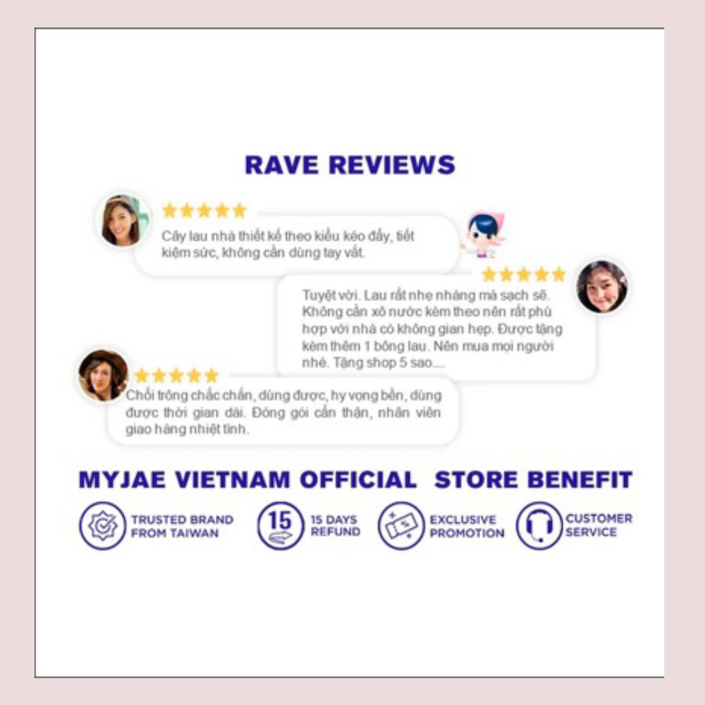 - Thiết kế gọn nhẹ, thoải mái khi di chuyển mà không tốn sức - Mâm lau hình chữ nhật, diện tích rộng giúp làm sạch nhanh chóng - Mặt lau làm bằng sợi dệt