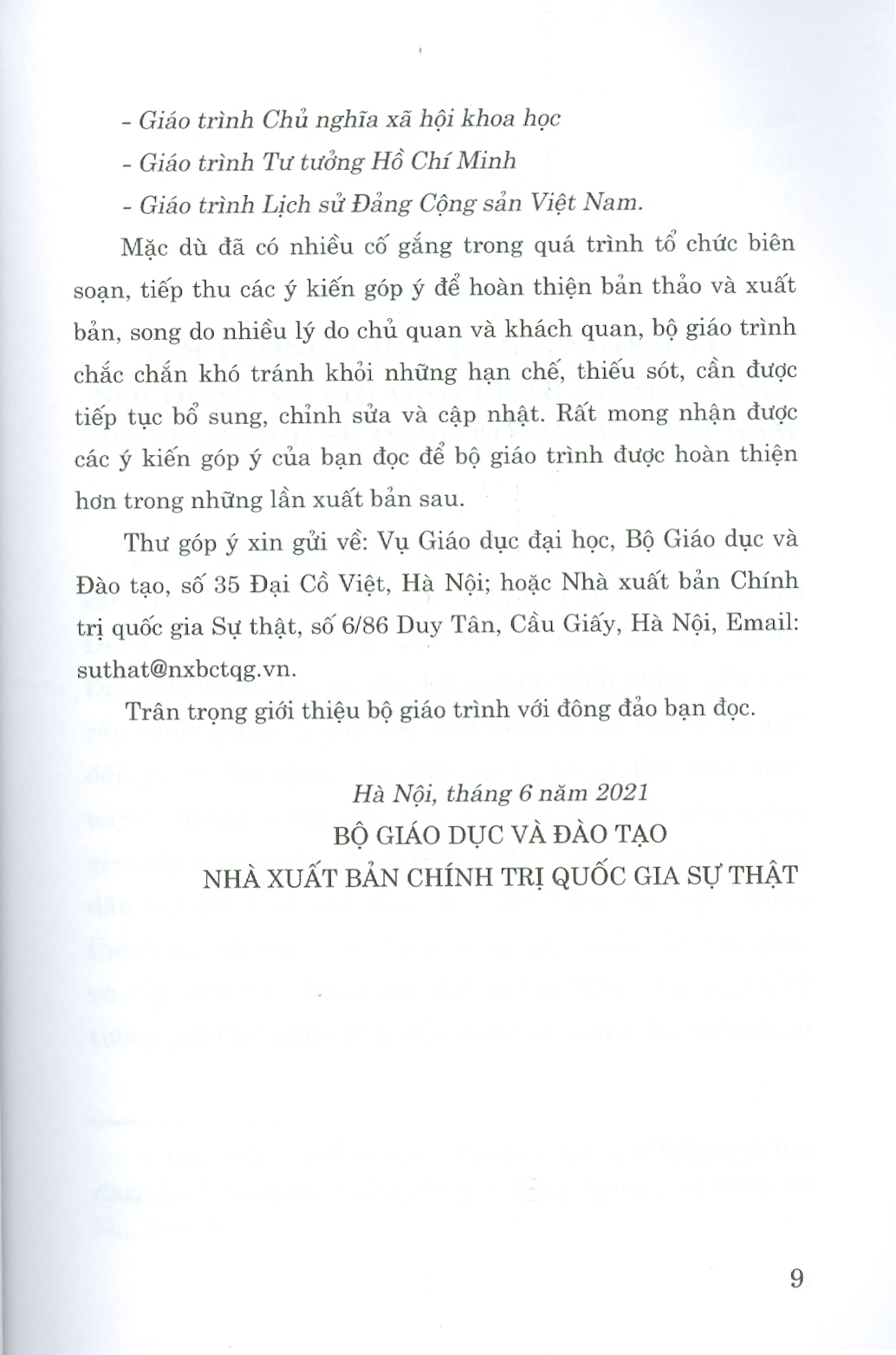 Bộ sách là tài liệu giảng dạy, học tập cho giảng viên, sinh viên các trường đại học theo chương trình mới do Bộ Giáo dục và Đào tạo và Nhà xuất bản Chính trị Quốc gia xuất bản.