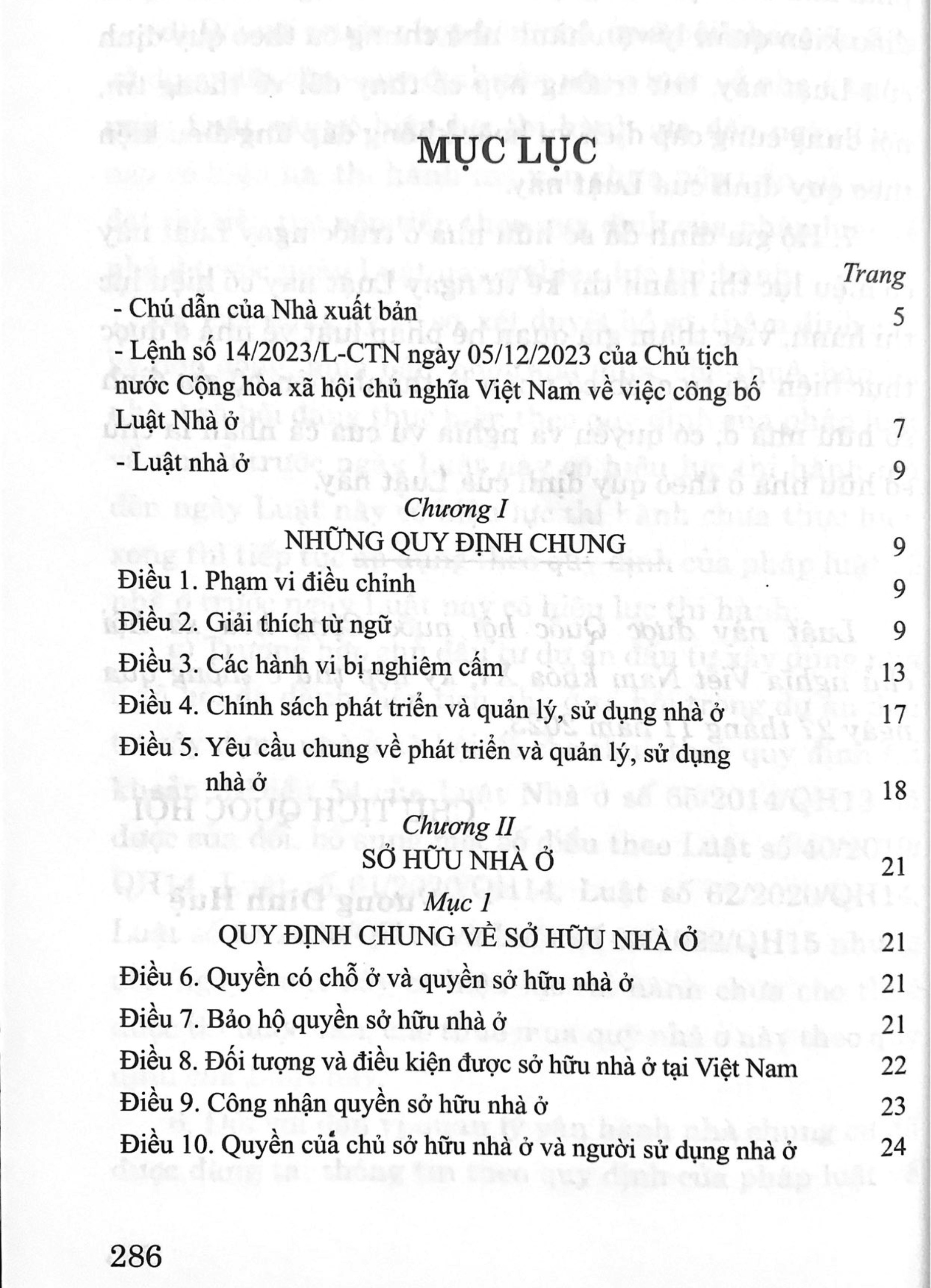 Luật Nhà ở năm 2023 được Quốc hội khóa XV thông qua tại kỳ họp thứ 6 ngày 27/11/2023 gồm 13 chương, 198 điều, điều chỉnh các vấn đề liên quan đến lĩnh vực nhà ở như: sở hữu nhà ở; chiến lược phát triển nhà ở quốc gia, chương trình, kế hoạch phát triển nhà ở cấp tỉnh; phát triển nhà ở; cải tạo, xây dựng lại nhà chung cư; chính sách về nhà ở xã hội; tài chính để phát triển nhà ở; quản lý, sử dụng nhà ở; quản lý, sử dụng nhà chung cư; giao dịch về nhà ở; quản lý nhà nước về nhà ở; giải quyết tranh chấp và xử lý vi phạm pháp luật về nhà ở.