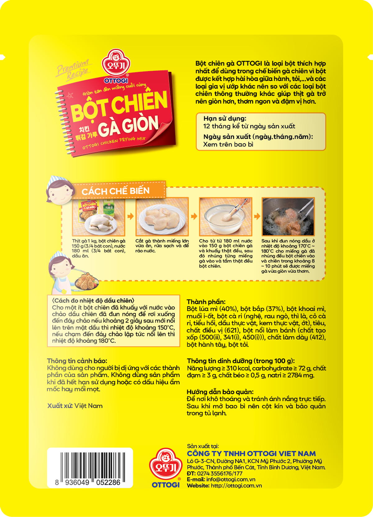 Bột chiên giòn Ottogi là sự kết hợp giữa các loại bột và gia vị tạo thành bột chiên đa năng với chất lượng dinh dưỡng cao, giòn rụm, xốp mềm, an toàn tiện dụng, chay mặn đều dùng được.