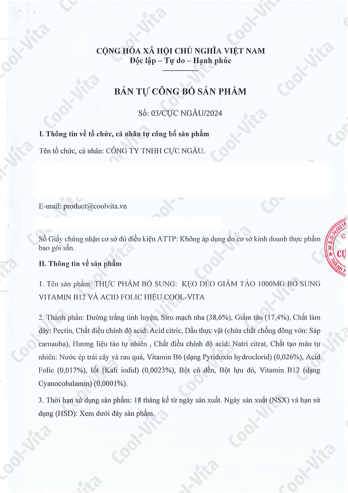 Kẹo dẻo giấm táo giúp bổ sung thêm Vitamin B12 & Axit Folic là một giải pháp bổ sung dinh dưỡng tiện lợi, hỗ trợ bạn cải thiện sức khỏe tiêu hóa, tăng cường hệ miễn dịch. Mỗi 2 viên kẹo dẻo chứa 1000mg giấm táo nguyên chất, kết hợp với các dưỡng chất quan trọng như Vitamin B12, Vitamin B6 và Axit Folic, mang lại hiệu quả tuyệt vời cho sức khỏe. Nếu bạn đang mong muốn cải thiện sức khỏe từ bên trong thì đừng nên bỏ qua sản phẩm Kẹo Dẻo Giấm Táo của CoolVita nhé!