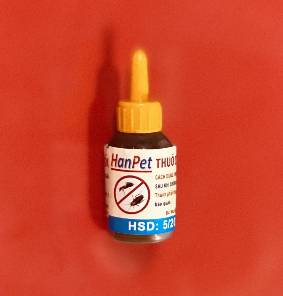 - Sản phẩm có mùi mật mía nhẹ nhẹ Đặc biệt sản phẩm dạng nhỏ giọt, không phải dạng xịt phun sương nên không lo ảnh hưởng đến môi trường xung quanh. Rất phù hợp với nhà có con nhỏ. Kiến ăn xong sẽ về tổ lây nhau chết hàng loạt. Cách sử dụng: Mở nắp lọ và dùng ống bóp có sẵn nhỏ ra vài giọt vào đường đi của kiến, hoặc nơi trú ẩn của gián. (Lưu ý không nhỏ lên bề mặt thấm thuốc, các bạn có thể nhỏ lên nền gạch, nền xi măng hoặc vật ko thấm nước). Để những nơi mà kiến thường đi qua hoặc ở gần tổ kiến. Với Dung dịch Diệt kiến Hanpet, chỉ sau 2 ngày bạn sẽ thấy kiến gián chết hàng loại và sau 1 tuần sẽ không còn thấy bóng dáng chúng trong ngôi nhà của bạn.