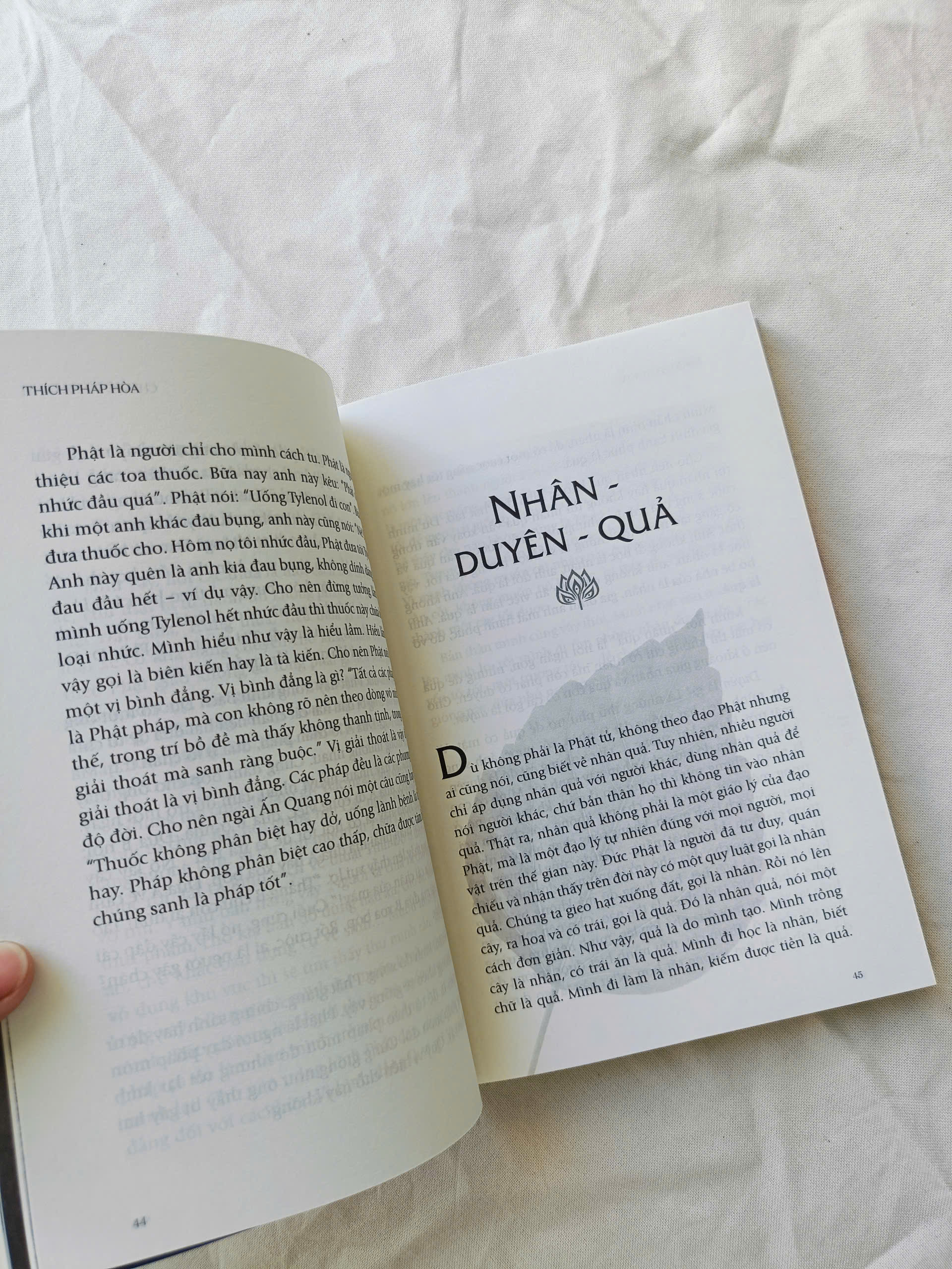 Trong quyển sách này, quý vị sẽ được tiếp cận Nhân Quả theo một cách giản dị qua những câu chuyện đời thường của thầy Thích Pháp Hòa. Trong khi ngôn ngữ của giáo lý thường là rào cản thì những câu chuyện vui, những ví dụ gần gũi lại có khả năng mang chúng ta đến gần hơn với sự thật của đời sống. Những lời chia sẻ và câu chuyện của thầy Pháp Hòa về các mối quan hệ và cách ứng xử trong xã hội như cha mẹ - con cái, vợ - chồng, thầy - trò, bạn bè, … cũng được ban biên tập tuyển chọn và giới thiệu đến quý bạn đọc. Thông qua đó, chúng ta thấy được “Phật pháp tại thế gian, bất ly thế gian giác” – Phật pháp không ở đâu xa ngoài đời sống thế gian.