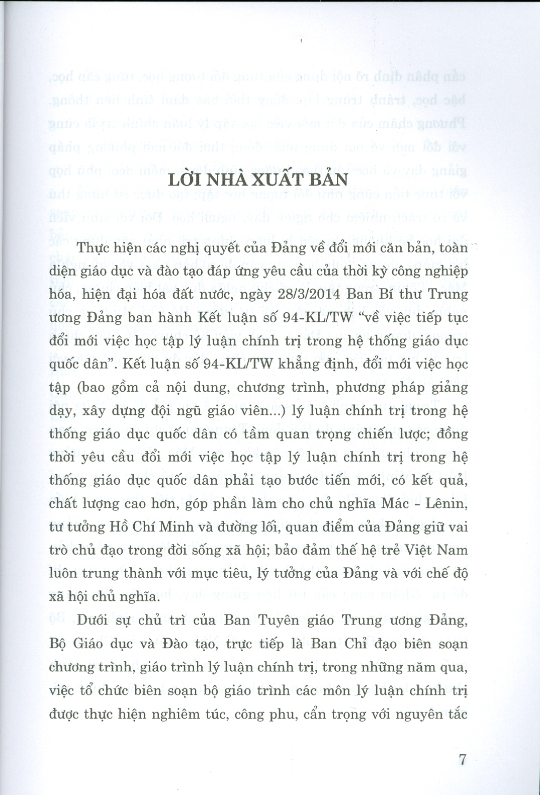 Bộ giáo trình được biên soạn theo tinh thần đổi mới cả về nội dung và phương pháp giảng dạy, tiếp cận với những phương pháp giáo dục mới, cập nhật những nghiên cứu, kiến thức lý luận chính trị mới, chú trọng liên hệ với thực tiễn công cuộc đổi mới, phát triển đất nước.
