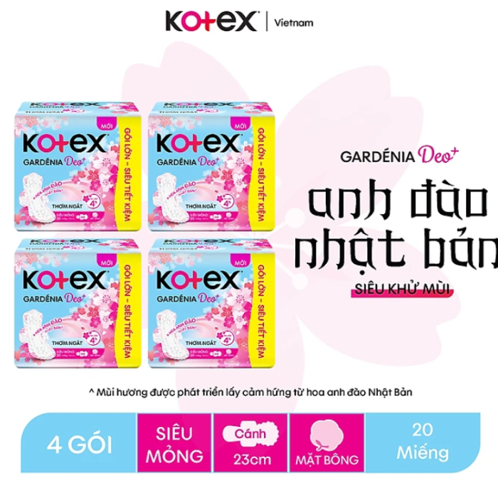 BVS KOTEX GARDENIA DEO+ HƯƠNG HOA ANH ĐÀO – SIÊU KHỬ MÙI – THƠM NGÁT LÊN ĐẾN 4H* Giúp bạn gái thổi bay nỗi lo về mùi trong kì kinh nguyệt với Hương hoa anh