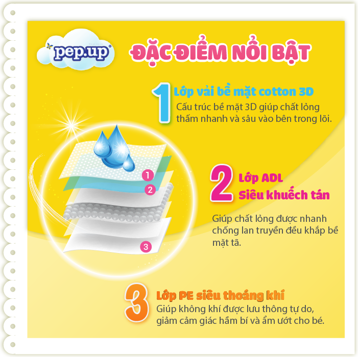 Tã/Bỉm Quần Em Bé Pep.up Cottony 3D Gói Đại Siêu Mềm Mại, Siêu Khô Thoáng, Kháng khuẩn Size S/M/L/XL I. THÔNG TIN SẢN PHẨM Thương hiệu:  Xuất xứ: Việt Nam Sản xuất tại: Công ty TNHH Javi - Lô LE6-02 Đường số 2, KCN Xuyên Á, Mỹ Hạnh Bắc, Đức Hòa, Long An Thành phần: Vải không dệt, hạt siêu thấm, PE thoáng khí, bông, giấy, lớp thấm hút thông minh,… Phân loại: Bề mặt 3D siêu mềm - Dạng quần Lưu ý: hướng dẫn chỉ mang tính chất tương đối. Mẹ nên cân nhắc vòng đùi của bé để lựa chọn size phù hợp với bé hơn. VI. HƯỚNG DẪN SỬ DỤNG Bước 1: Mẹ hãy luồn tay từ phía dưới tã và nhẹ nhàng xỏ hai chân bé vào hai ống quần của tã. Sau đó kéo tã lên trên rốn. Bước 2: Kéo đai lưng, điều chỉnh vách ngăn chống tràn. Bước 3: Thay tã sau 3-4h sử dụng hoặc sau khi tã bị vấy bẩn. Bước 4: Bỏ tã vào sọt rác. Lưu ý: không được bỏ tã vào bồn vệ sinh.