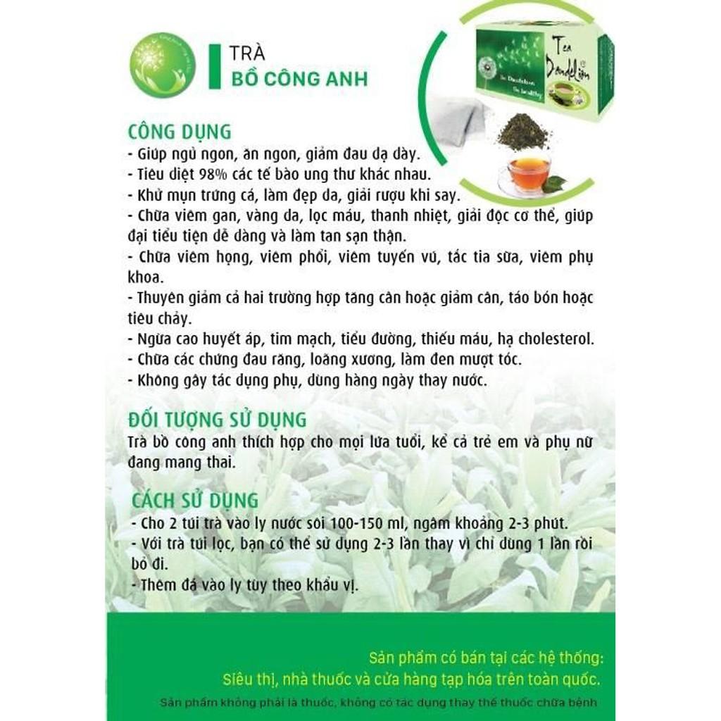 Trà túi lọc Bồ công anh được làm từ thân, lá và rễ cây bồ công anh tươi, được phơi khô sau đó đem xay nhuyễn cùng một ít lá cỏ ngọt (giúp trà có vị ngọt dịu, thơm mát) và cho vào từng túi nhỏ, với ưu điểm như vậy, trà bồ công anh mang lại sự tiện lợi cho người sử dụng và không phải lo lắng về thành phần của trà. Trong những ngày hè oi ả nóng bức như thế này, một ly trà bồ công anh sẽ mang lại cho bạn cảm giác “mát từ trong ra ngoài”, không những thế còn giúp cho hệ tiêu hóa hoạt động tốt, mát gan, lợi tiểu, đẹp da sẽ là những gì bạn sẽ cảm nhận được ngay sau khi uống Trà Bồ Công Anh.