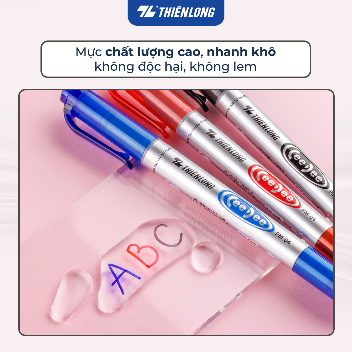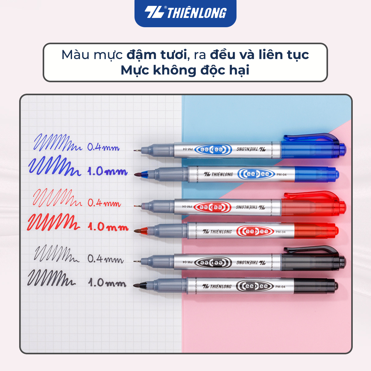 Bút lông dầu Thiên Long PM-04 là sản phẩm mới được sản xuất theo công nghệ hiện đại, đạt tiêu chuẩn chất lượng quốc tế, kiểu dáng được cải tiến ấn tượng. Sản phẩm có 2 đầu mực lớn nhỏ giúp đa dạng nét viết, thuận tiện khi sử dụng.   TÍNH NĂNG SẢN PHẨM ️ Màu mực đậm tươi, mực ra đều và liên tục.  ️ Mực nhanh khô, không độc hại với 3 màu mực xanh/ đỏ/ đen (tùy loại). ️ Bút có đầu lớn 1.0mm và đầu nhỏ 0.4mm giúp đa dạng nét viết, thuận tiện khi sử dụng.  ️ Độ bám dính của mực tốt trên các vật liệu: Giấy, gỗ, da, nhựa, thủy tinh, kim loại, gốm, sứ, đĩa CD. ️ Kiểu dáng được cải tiến ấn tượng, thân bút cầm chắc tay, dễ cầm nắm, không gây mỏi tay khi sử dụng.  ️ Sản phẩm phù hợp cho nhân viên văn phòng, học sinh, sinh viên.    TIÊU CHUẨN VÀ BẢO QUẢN ️ Tiêu chuẩn: Sản phẩm được thiết kế an toàn theo tiêu chuẩn ISO 11540. Sản xuất theo tiêu chuẩn TCCS 004:2011/TL-BLD.  ️ Đóng gói: 10 cây / hộp.  ️ Trọng lượng: 10 gram.  ️ Bảo quản: Không thích hợp cho trẻ dưới 3 tuổi. Bảo quản nơi khô ráo, thoáng mát, tuyệt đối tránh xa nguồn nhiệt, hóa chất. Đậy nắp sau khi sử dụng.   Tập đoàn Thiên Long là công ty hàng đầu trong ngành văn phòng phẩm tại Việt Nam, chuyên cung cấp các sản phẩm và dịch vụ chất lượng cao cho quý khách hàng. Hiện tại, Thiên Long có 4 nhãn hàng nổi tiếng được phân phối rộng khắp trong và ngoài nước là Thiên Long, Flexoffice, Colokit và Bizner.