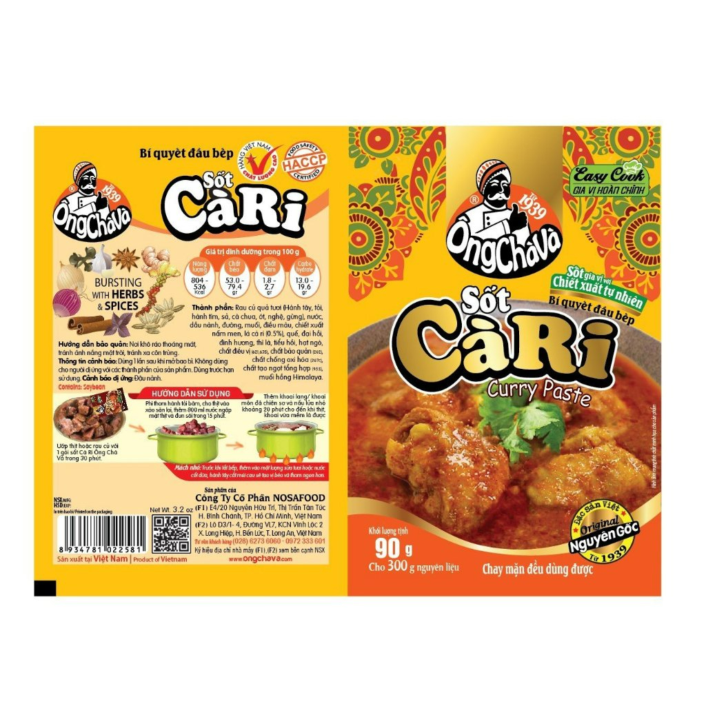 Sốt Cà ri Ông Chà Và 90g là loại gia vị nêm sẵn được sản xuất trên quy trình công nghệ hiện đại, nguồn nguyên liệu chất lượng, đảm bảo an toàn cho người sử dụng. 1. THÔNG TIN SẢN PHẨM - Thương hiệu: Ông Chà Và - Trọng lượng: 90gram - Số lượng: 15 gói - Thành phần: Rau củ quả tươi (hành tây, tỏi, hành tím, sả, cà chua, ớt, nghệ, gừng), nước, dầu nành, đường, muối, điều màu, chiết xuất nấm men, lá cà ri (0.5%), quế, đại hồi, đinh hương, thì là, tiểu hồi, hạt ngò, chất điều vị (621, 651), muối hồng Himalaya,... - HSD: 12 tháng kể từ ngày sản xuất. - Nhà sản xuất: Công ty cổ phần Nosafood. - Địa chỉ sản xuất: Lô D3/1-4 Đường VL7, KCN Vĩnh Lộc 2, xã Long Hiệp, huyện. Bến Lức, tỉnh Long An. 2. MỘT SỐ MÓN ĂN GỢI Ý Dùng làm gia vị cho món Cà Ri - Hướng dẫn sử dụng: + Bước 1: Ướp thịt hoặc rau củ với 1 gói sốt Cà Ri Ông Chà Và trong 30 phút. +