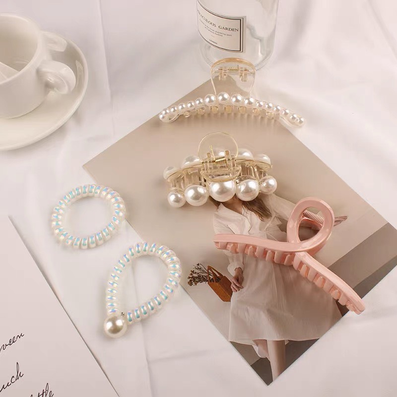 Bộ 5 món kẹp tóc đính ngọc trai, cột tóc Hàn Quốc phong cách trẻ trung xinh xắn KT28 Kẹp càng cua, dây buộc tóc đính ngọc trai là món phụ kiện tóc rất được