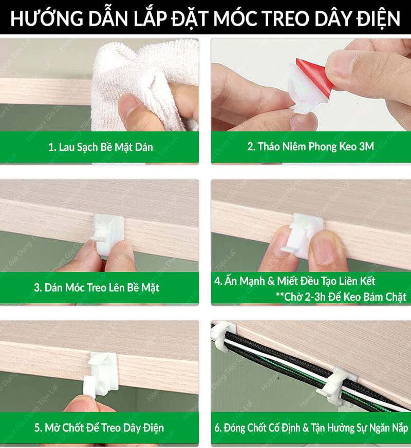 - Đóng gói: Combo 5 móc treo dây điện keo 3M dính sẵn HƯỚNG DẪN LẮP ĐẶT:
