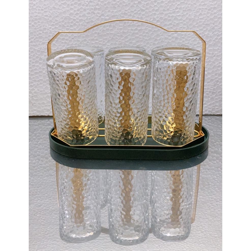 ✨Combo 6 cốc ống thủy tinh uống nước chịu nhiệt cao cấp vân sần kèm giá úp cốc có khay hứng nước ngọng vàng