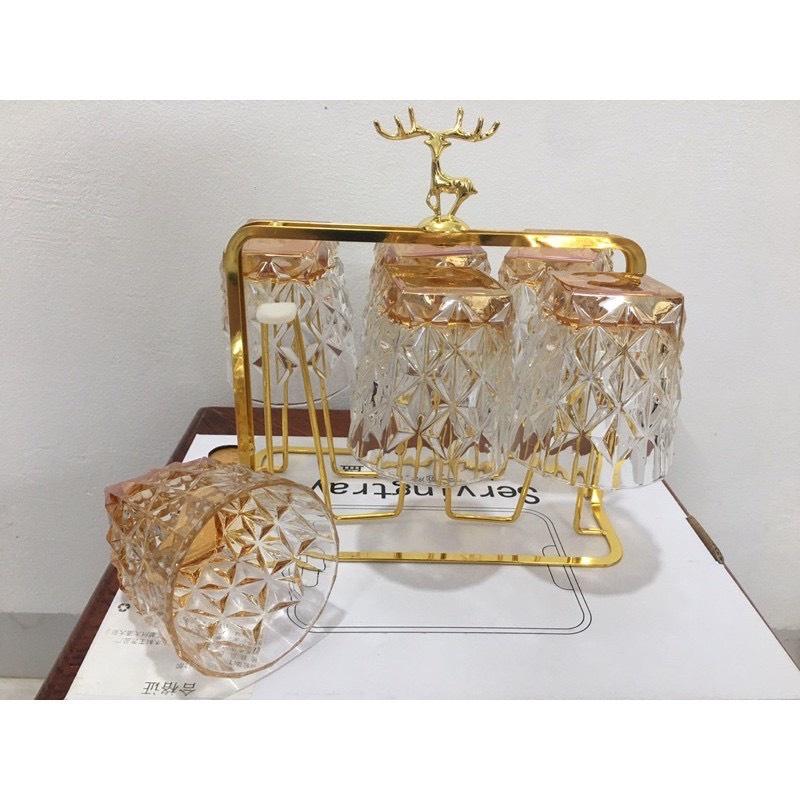 Combo Bộ 6 cốc thủy tinh cao cấp kèm giá úp tròn có khay hứng Combo gồm: 1 bình 6 cốc cốc 1 giá úp hươu 1 khay vương miện