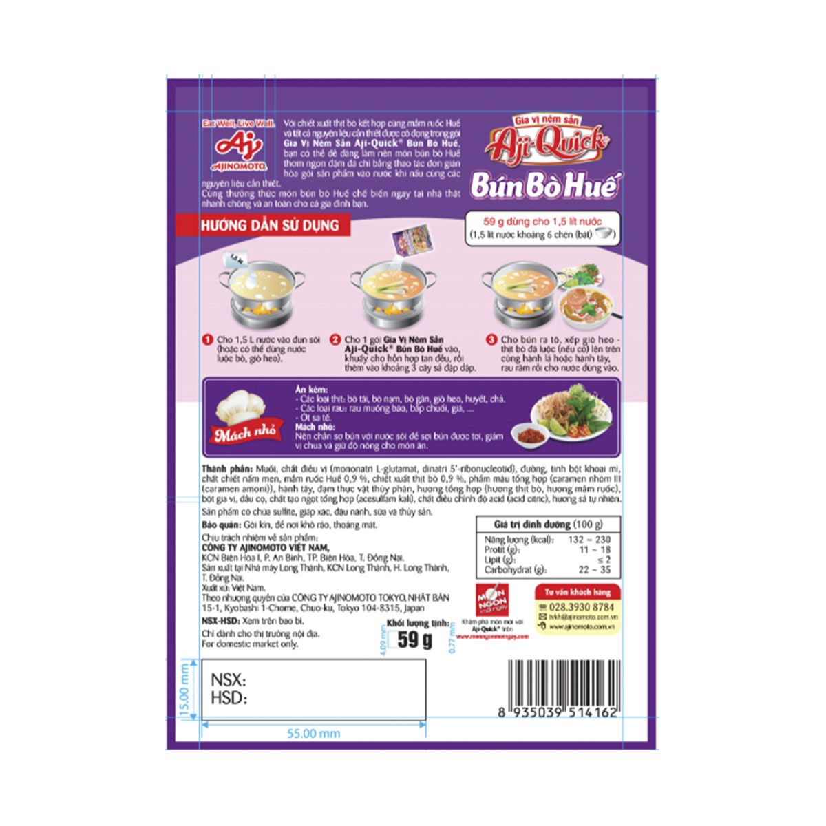 Thành phần: Muối, chất điều vị (mononatri L-glutamat, dinatri 5'-ribonucleotid), đường, tinh bột khoai mì, chất chiết nấm men, mắm ruốc Huế 0,9%, chiết xuất thịt bò 0,9%, phẩm màu tổng hợp (caramen nhóm III (caramen amoni)), hành tây, đạm thực vật thủy phân, hương tổng hợp (hương thịt bò, hương mắm ruốc), bột gia vị, dầu cọ, chất tạo ngọt tổng hợp (acesulfam kali), chất điều chỉnh độ acid (acid citric), hương sả tự nhiên.