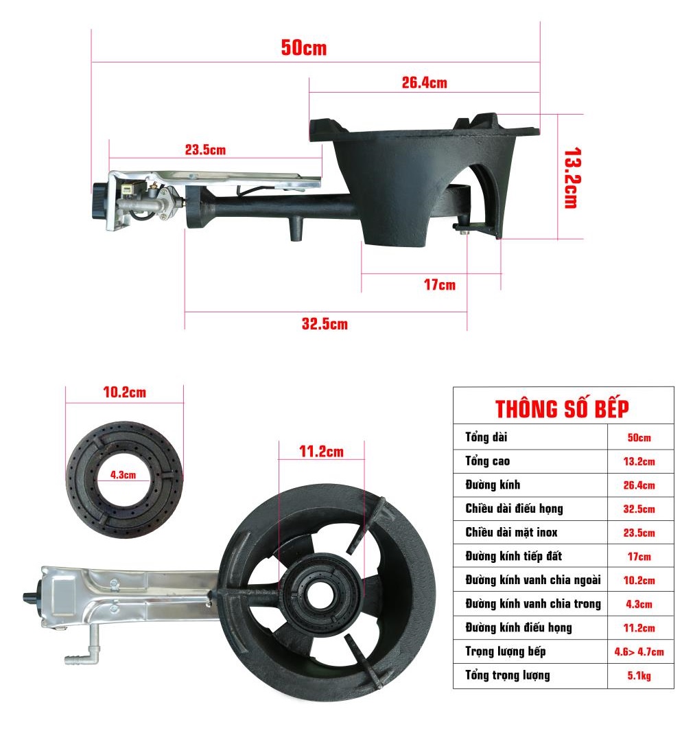 THÔNG SỐ KỸ THUẬT Tên sản phẩm: Bếp khè gas công nghiệp Namilux Tặng kèm 1 van ga cao áp Namilux + 2m dây ga Thái chuyên dụng + 2 cổ dê (đai thép) Thương
