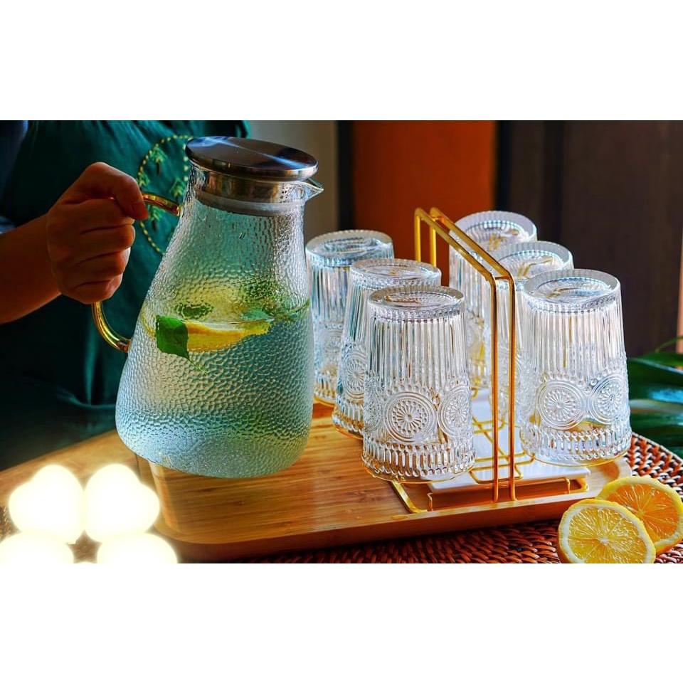 ✨Combo bình đựng nước thủy tinh chịu nhiệt vân sần kèm 6 cốc trống cao, khay tre và giá úp cốc