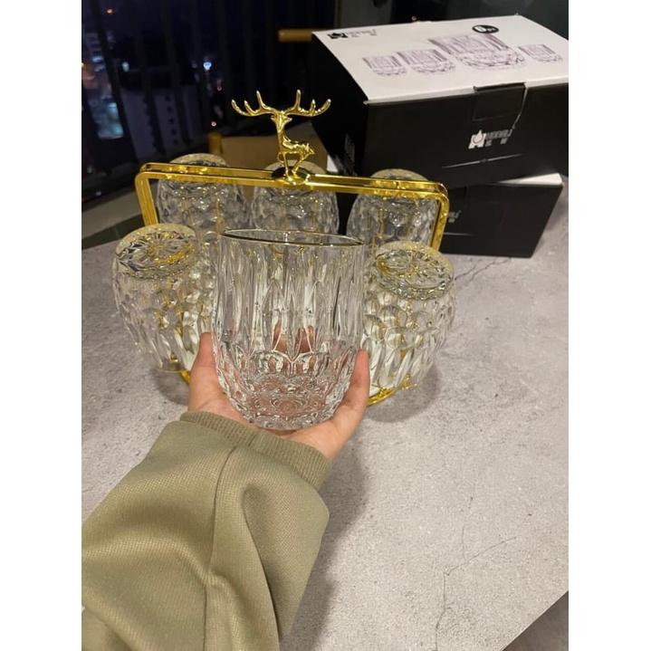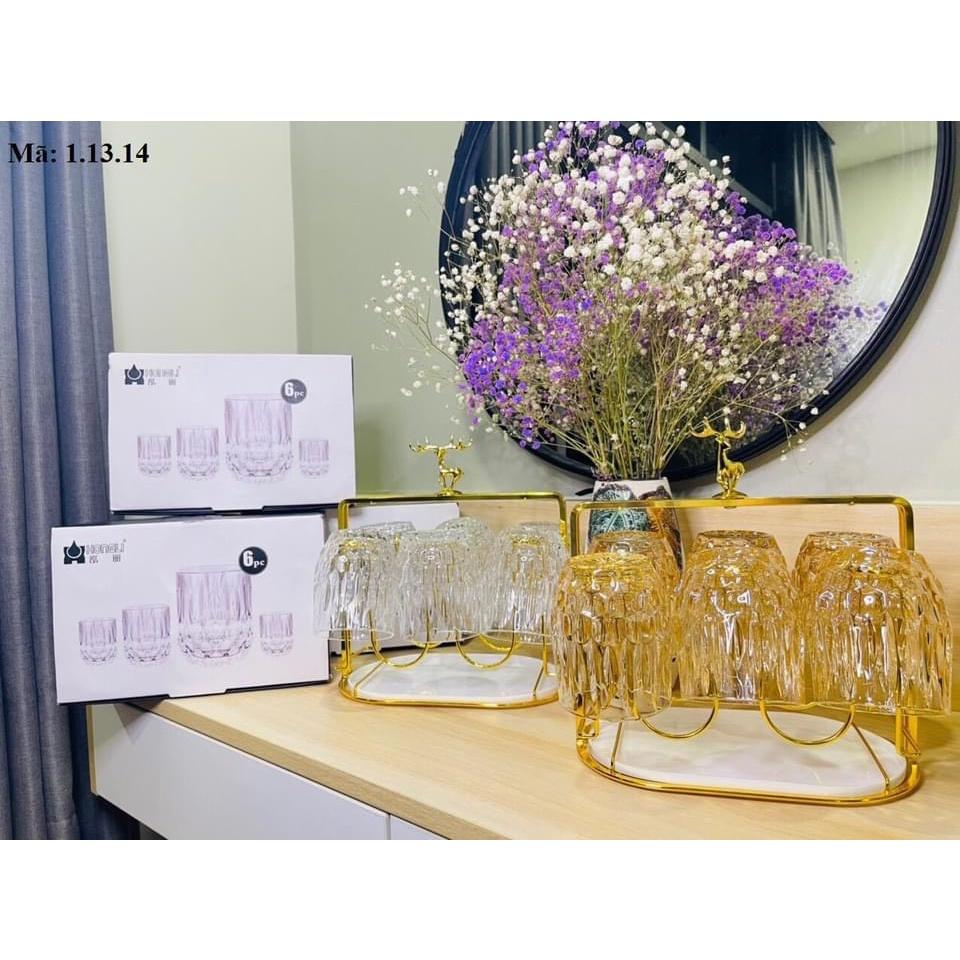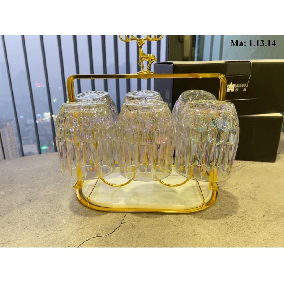 Combo Bộ 6 cốc thủy tinh cao cấp kèm giá úp tròn có khay hứng Combo gồm: 1 bình 6 cốc cốc 1 giá úp hươu 1 khay vương miện