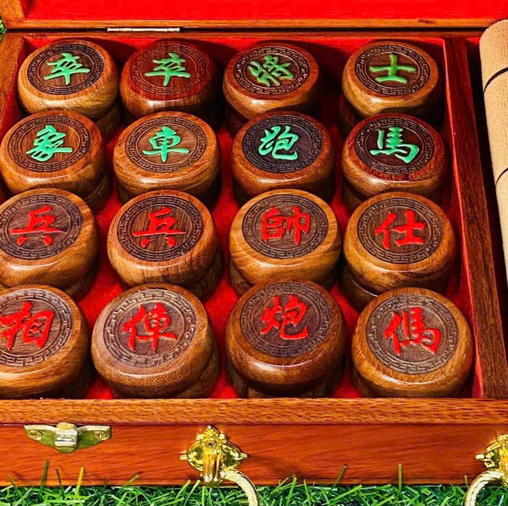 _ Quân cờ tướng gỗ trắc hộp đựng quân được làm bằng chất liệu gỗ tự nhiên 100% _ Kt quân cờ mặt tròn 4.5×1.6cm  _ Kt hộp đựng quân 28×20×7cm  _ Quân cờ và