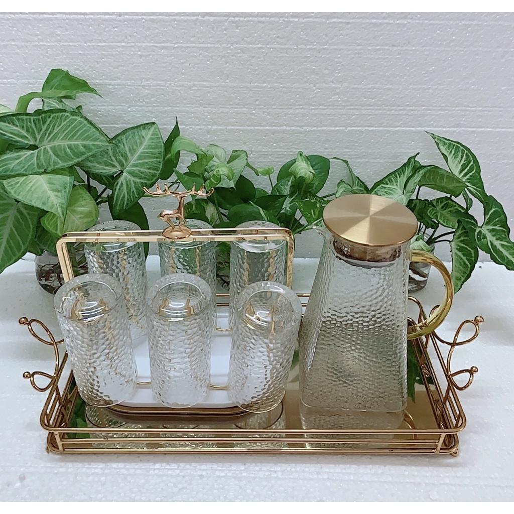 ✨COMBO BỘ BÌNH CỐC THỦY TINH CHỊU NHIỆT CAO CẤP KÈM KHAY VƯƠNG MIỆN VÀNG VÀ GIÁ ÚP CỐC