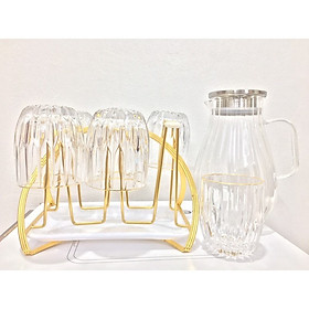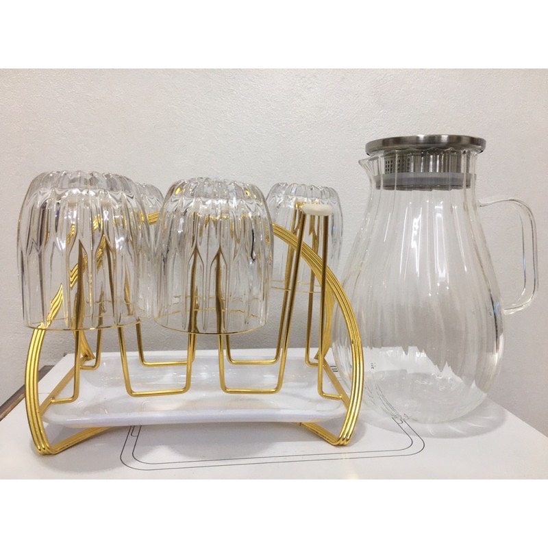 Bộ sản phẩm gồm: 1 bình thủy tinh đựng nước + 6 cốc + 1 GIÁ ÚP CỐC