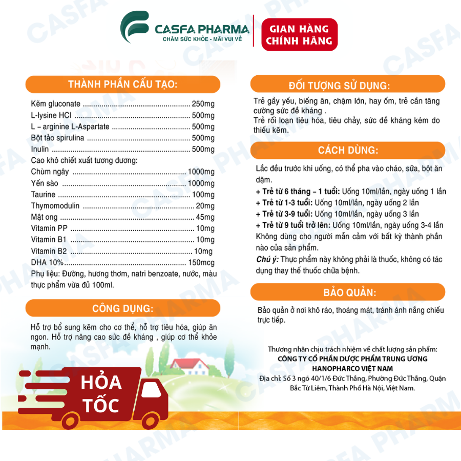 Combo Canxi Hữu Cơ Cho Bé: CANXI BOBBY và Kẽm ZIN C BOBBY KID TW Hanopharco ✪ THÀNH PHẦN CANXI BOBBY Trong 100ml có chứa: Canxi gluconat: 5000mg L-lysin HCl: 5000mg Canxi lactat: 2500mg Inulin: 500mg Taurin: 250mg Sữa non: 250mg Yến sào: 250mg Thymomodulin: 50mg Vitamin PP: 20mg Vitamin B1: 20mg Vitamin B6: 20mg Vitamin K2-MK7: 500mcg Vitamin D3: 2500IU Phụ liệu: Đường, nước tinh khiết, natri citrate, natri benzoate, kali sorbate vừa đủ 100ml. ✪ CÔNG DỤNG CANXI BOBBY Hỗ trợ bổ sung Canxi và Vitamin D cho cơ thể. Giúp phát triển chiều cao cho trẻ trong độ tuổi tiền dậy thì và dậy thì. Cung cấp các vitamin thiết yếu giúp phát triển hệ xương và răng chắc khỏe. Ngăn ngừa loãng xương cho người lớn, bổ sung Canxi theo chỉ định của bác sĩ. ✪ ĐỐI TƯỢNG SỬ DỤNG Trẻ em còi xương, chậm lớn, chậm mọc răng. Trẻ trong độ tuổi phát triển chiều cao (tiền dậy thì và dậy thì). Người lớn tuổi, muốn ngăn ngừa loãng xương. Người cần bổ sung Canxi theo chỉ định. ✪ CÁCH DÙNG CANXI BOBBY Trẻ từ 6 tháng - 6 tuổi: 1 gói 10ml/ngày (sáng và trưa sau ăn). Trẻ trên 6 tuổi, người lớn, phụ nữ có thai và cho con bú: 2 gói 10ml/ngày. ✪ Kẽm ZIN C BOBBY KID - Hỗ Trợ Biếng Ăn và Tăng Cường Sức Đề Kháng Cho Trẻ (Hộp 20 Gói) ✪ THÀNH PHẦN KẼM ZIN C BOBBY KID L-lysine HCl: 500mg L-arginine L-Aspartate: 500mg Bột tảo spirulina: 500mg Inulin: 500mg Kẽm gluconate: 250mg Bột Chùm ngây: 100mg Yến sào: 100mg Taurine: 100mg Mật ong: 45mg Thymomodulin: 20mg Vitamin PP: 10mg Vitamin B1: 10mg Vitamin B2: 10mg DHA 10%: 150mcg Phụ liệu: Đường, hương thơm, natri benzoate, nước, màu thực phẩm vừa đủ 100ml. ✪ CÔNG DỤNG KẼM ZIN C BOBBY KID Cung cấp kẽm, lysine và DHA giúp cải thiện biếng ăn và tăng cường sức đề kháng. Hỗ trợ cải thiện tình trạng suy dinh dưỡng, tiêu chảy và tiêu hóa kém. Tăng cường khả năng hấp thụ dinh dưỡng và hỗ trợ sự phát triển toàn diện của trẻ. ✪ ĐỐI TƯỢNG SỬ DỤNG KẼM ZIN C BOBBY KID Trẻ em cần bổ sung kẽm, lysine, DHA cho cơ thể. Trẻ có biếng ăn, sức đề kháng yếu, tiêu hóa kém hoặc bị tiêu chảy. Trẻ bị suy dinh dưỡng, sau ốm hoặc cần phát triển toàn diện. ✪ CÁCH DÙNG KẼM ZIN C BOBBY KID Trẻ từ 6 tháng - 3 tuổi: 1 ống 10ml/ngày. Trẻ 4 - 8 tuổi: 2 lần/ngày, mỗi lần 1 ống 10ml. Trẻ từ 9 tuổi trở lên: 3 lần/ngày, mỗi lần 10ml. LƯU Ý: Sản phẩm không phải là thuốc và không thay thế thuốc chữa bệnh. CAM KẾT VỚI KHÁCH HÀNG Cam kết 100% sản phẩm chính hãng. Sản phẩm chất lượng, dịch vụ khách hàng chu đáo.