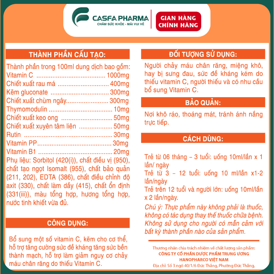 - VITAMIN C THÀNH PHẦN: Trong 100ml có chứa:
