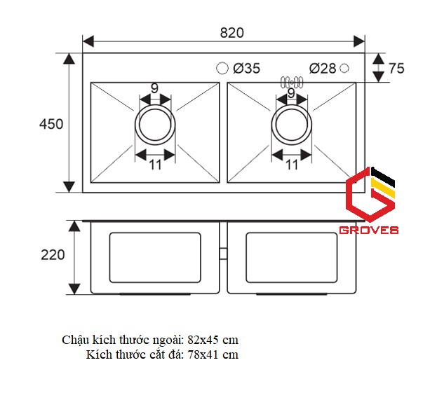 ️ Kích thước chậu: 820450240 (dài x rộng x cao): Bảo hành 3 năm (kiểu chậu đúc 2 hố cân) ️ kích thước khoét đá: 770 * 400 cm (trừ mỗi bên 4-:- 5 cm là đẹp nhất)
