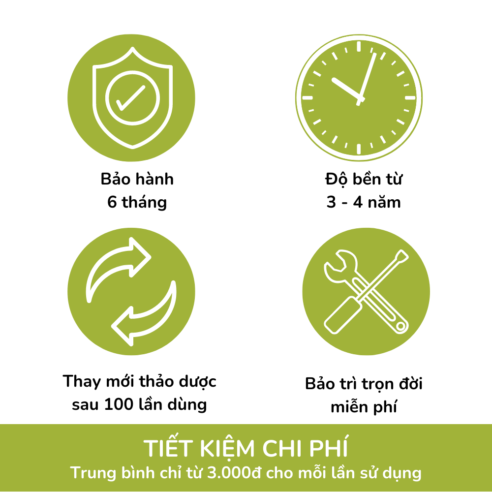 - Độ bền cao (3 – 4 năm). Lõi thảo dược thay thế dễ dàng sau 100 lần dùng