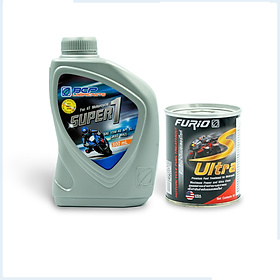 Combo 1 lon nhớt xe máy tổng hợp toàn phần FURIO Super 1 - SAE 10W40 - API SN - JASO MA2 - 1 Lít + 1 chai dung dịch vệ sinh động cơ BCP